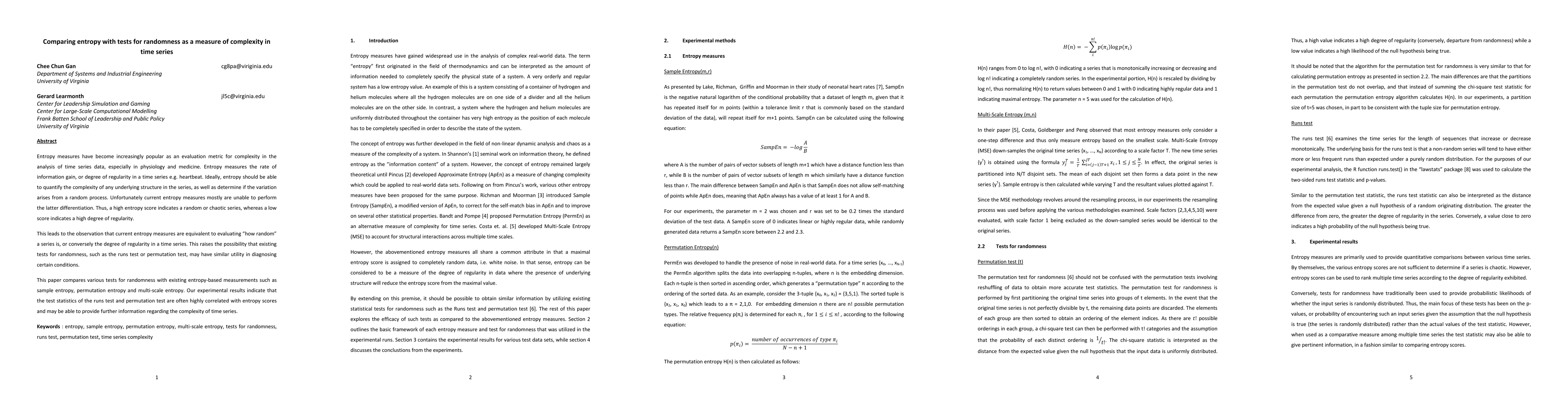Entropy measures have become increasingly popular as an evaluation metric for complexity in the analysis of time series data, especially in physiology and medicine. Entropy measures the rate of information gain, or degree of regularity in a time series e.g. heartbeat. Ideally, entropy should be able to quantify the complexity of any underlying structure in the series, as well as determine if the variation arises from a random process. Unfortunately current entropy measures mostly are unable to perform the latter differentiation. Thus, a high entropy score indicates a random or chaotic series, whereas a low score indicates a high degree of regularity. This leads to the observation that current entropy measures are equivalent to evaluating how random a series is, or conversely the degree of regularity in a time series. This raises the possibility that existing tests for randomness, such as the runs test or permutation test, may have similar utility in diagnosing certain conditions. This paper compares various tests for randomness with existing entropy-based measurements such as sample entropy, permutation entropy and multi-scale entropy. Our experimental results indicate that the test statistics of the runs test and permutation test are often highly correlated with entropy scores and may be able to provide further information regarding the complexity of time series.