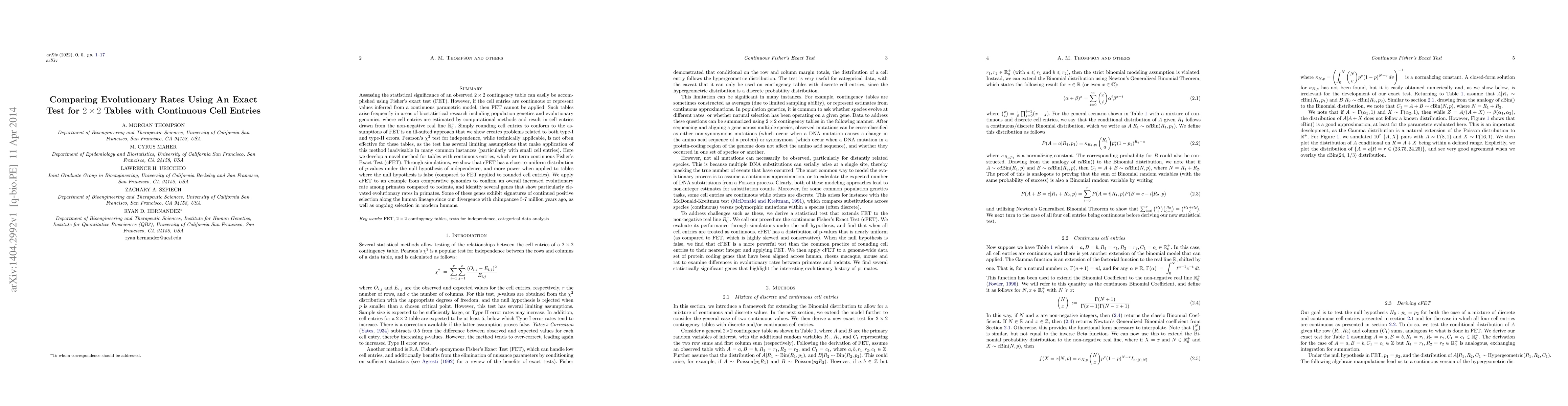 Assessing the statistical significance of an observed 2x2 contingency table can easily be accomplished using Fisher's exact test (FET). However, if the cell entries are continuous or represent values inferred from a continuous parametric model, then FET cannot be applied. Such tables arise frequently in areas of biostatistical research including population genetics and evolutionary genomics, where cell entries are estimated by computational methods and result in cell entries drawn from the non-negative real line R+. Simply rounding cell entries to conform to the assumptions of FET is an ill-suited approach that we show creates problems related to both type-I and type-II errors. Pearson's chi^2 test for independence, while technically applicable, is not often effective for these tables, as the test has several limiting assumptions that make application of this method inadvisable in many common instances (particularly with small cell entries). Here we develop a novel method for tables with continuous entries, which we term continuous Fisher's Exact Test (cFET). Through simulations, we show that cFET has a close-to-uniform distribution of p-values under the null hypothesis of independence, and more power when applied to tables where the null hypothesis is false (compared to FET applied to rounded cell entries). We apply cFET to an example from comparative genomics to confirm an overall increased evolutionary rate among primates compared to rodents, and identify several genes that show particularly elevated evolutionary rates in primates. Some of these genes exhibit signatures of continued positive selection along the human lineage since our divergence with chimpanzee 5-7 million years ago, as well as ongoing selection in modern humans.