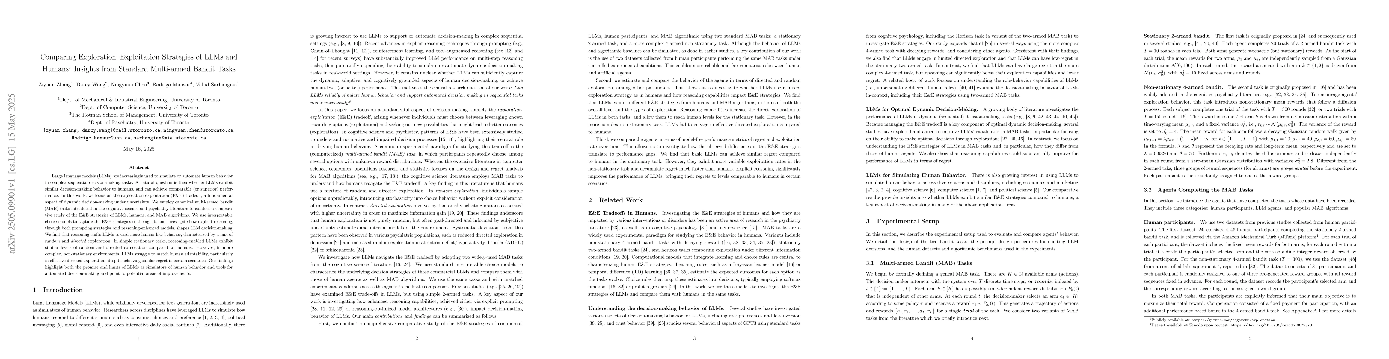 This work distinguishes itself by directly comparing LLMs, humans, and MAB algorithms on E&E strategies, emphasizing the role of reasoning in shaping LLM behavior.