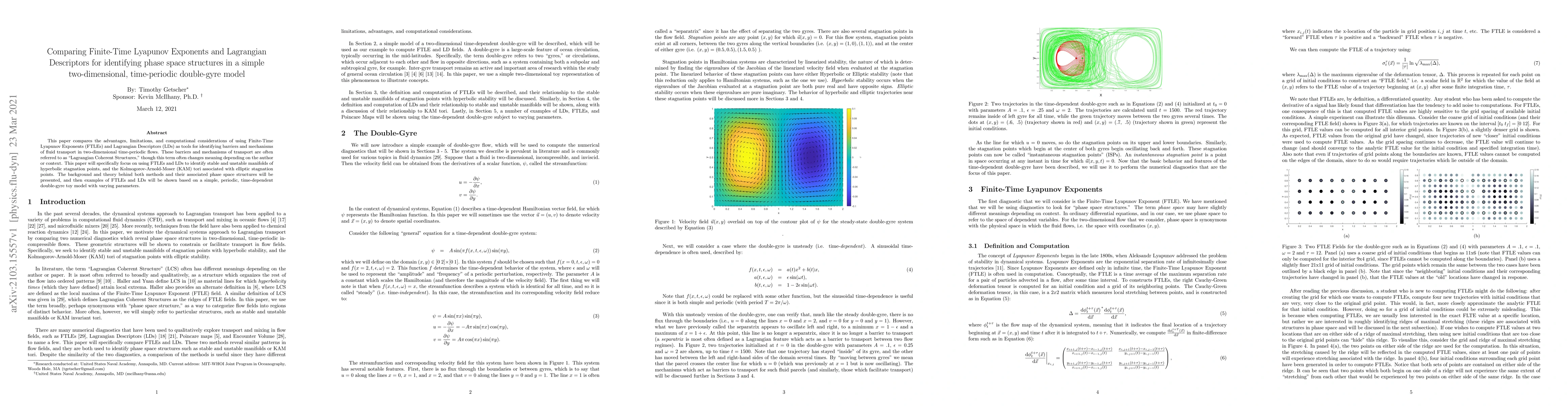 This paper compares Finite-Time Lyapunov Exponents (FTLEs) and Lagrangian Descriptors (LDs) for identifying Lagrangian Coherent Structures in a two-dimensional time-periodic double-gyre model, focusing on stable and unstable manifolds and KAM tori. It presents the theoretical background of both methods and demonstrates their application through examples.