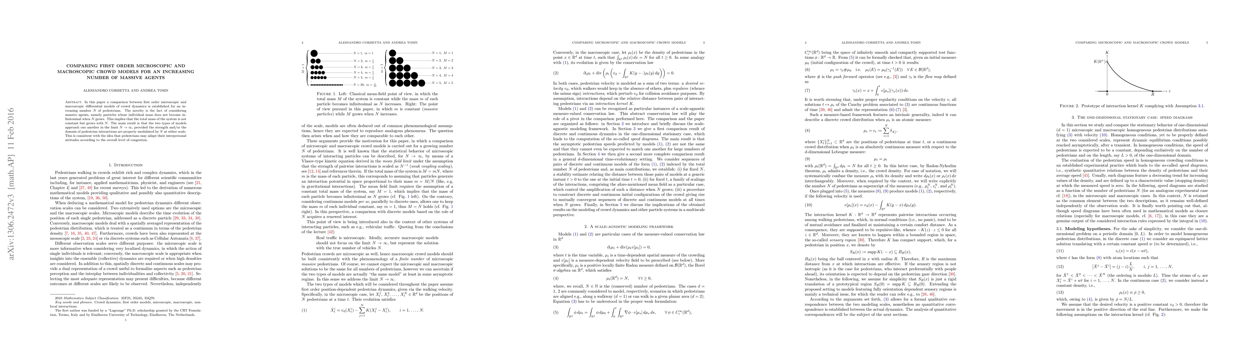 In this paper a comparison between first order microscopic and macroscopic differential models of crowd dynamics is established for an increasing number $N$ of pedestrians. The novelty is the fact of considering massive agents, namely particles whose individual mass does not become infinitesimal when $N$ grows. This implies that the total mass of the system is not constant but grows with $N$. The main result is that the two types of models approach one another in the limit $N\to\infty$, provided the strength and/or the domain of pedestrian interactions are properly modulated by $N$ at either scale. This is consistent with the idea that pedestrians may adapt their interpersonal attitudes according to the overall level of congestion.