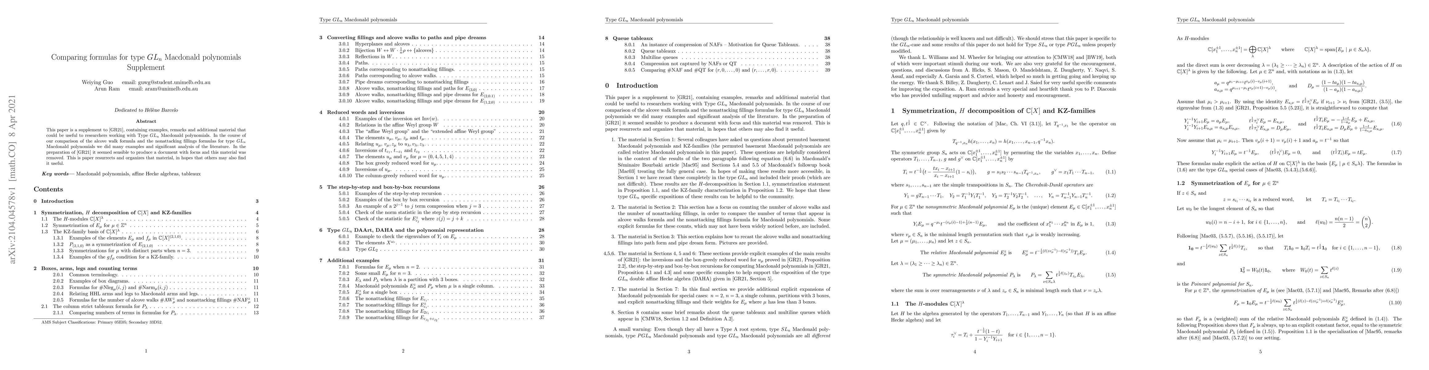 This paper is a supplement to Guo-Ram arXiv:2104.02942, containing examples, remarks and additional material that could be useful to researchers working with Type $GL_n$ Macdonald polynomials. In the course of our comparison of the alcove walk formula and the nonattacking fillings formulas for type $GL_n$ Macdonald polynomials we did many examples and significant analysis of the literature. In the preparation of Guo-Ram arXiv:2104.02942 it seemed sensible to produce a document with focus and this material was removed. This is paper resurrects and organizes that material, in hopes that others may also find it useful.