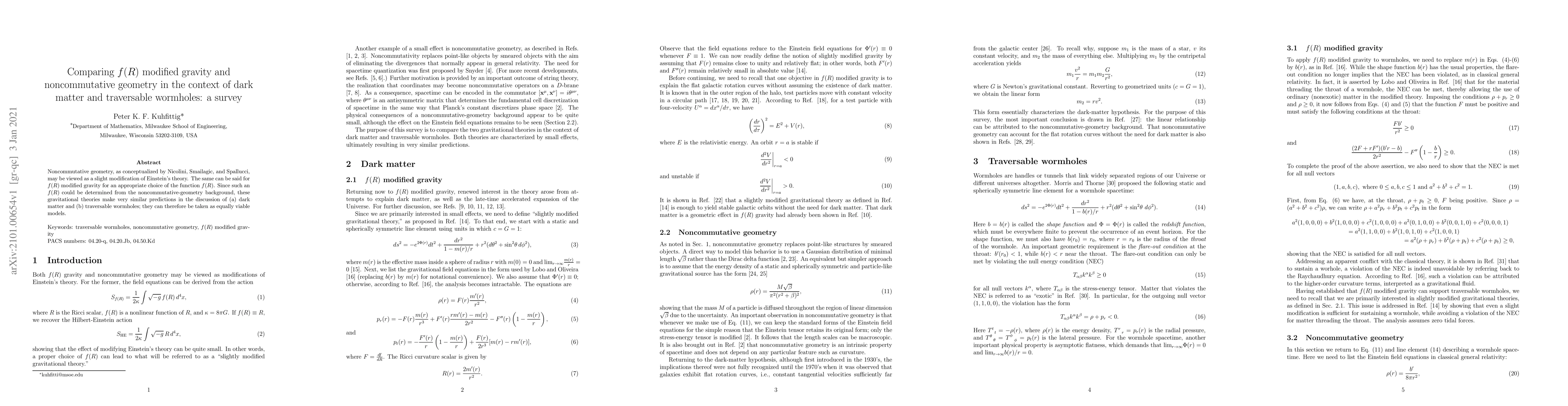 This paper surveys how noncommutative geometry and $f(R)$ modified gravity predict similar phenomena regarding dark matter and traversable wormholes, suggesting both theories are equally viable alternatives to Einstein's general relativity.