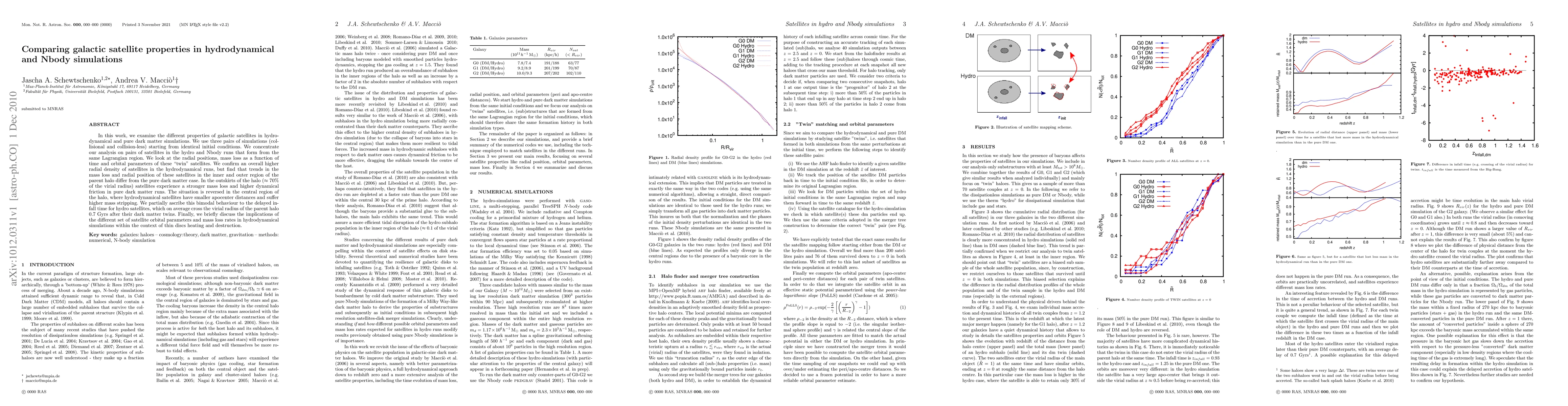In this work, we examine the different properties of galactic satellites in hydrodynamical and pure dark matter simulations. We use three pairs of simulations (collisional and collision-less) starting from identical initial conditions. We concentrate our analysis on pairs of satellites in the hydro and Nbody runs that form from the same Lagrangian region. We look at the radial positions, mass loss as a function of time and orbital parameters of these "twin" satellites. We confirm an overall higher radial density of satellites in the hydrodynamical runs, but find that trends in the mass loss and radial position of these satellites in the inner and outer region of the parent halo differ from the pure dark matter case. In the outskirts of the halo (~70% of the virial radius) satellites experience a stronger mass loss and higher dynamical friction in pure dark matter runs. The situation is reversed in the central region of the halo, where hydrodynamical satellites have smaller apocenter distances and suffer higher mass stripping. We partially ascribe this bimodal behaviour to the delayed infall time for hydro satellites, which on average cross the virial radius of the parent halo 0.7 Gyrs after their dark matter twins. Finally, we briefly discuss the implications of the different set of satellite orbital parameters and mass loss rates in hydrodynamical simulations within the context of thin discs heating and destruction.