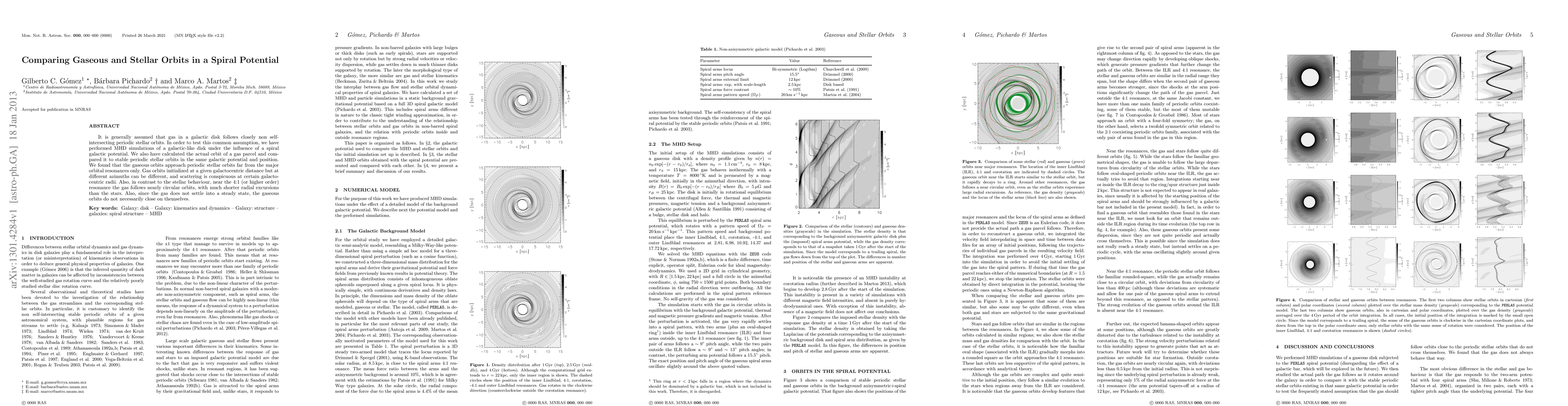 This paper compares gaseous and stellar orbits in a spiral galactic potential using MHD simulations, finding that gas orbits diverge from stellar orbits, especially near resonances, and do not settle into periodic paths like stars.