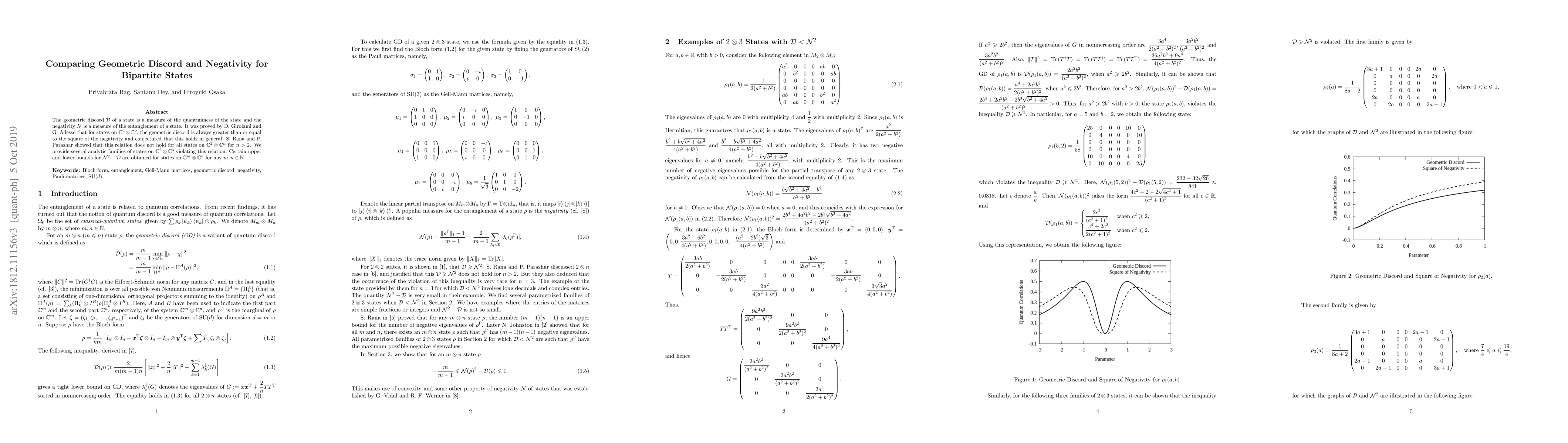 The geometric discord $\mathcal{D}$ of a state is a measure of the quantumness of the state and the negativity $\mathcal{N}$ is a measure of the entanglement of a state. It was proved by D. Girolami and G. Adesso that for states on $\mathbb{C}^2\otimes\mathbb{C}^2$, the geometric discord is always greater than or equal to the square of the negativity and conjectured that this holds in general. S. Rana and P. Parashar showed that this relation does not hold for all states on $\mathbb{C}^2\otimes\mathbb{C}^n$ for $n>2$. We provide several analytic families of states on $\mathbb{C}^2\otimes\mathbb{C}^3$ violating this relation. Certain upper and lower bounds for $\mathcal{N}^2-\mathcal{D}$ are obtained for states on $\mathbb{C}^m\otimes\mathbb{C}^n$ for any $m, n\in\mathbb{N}$.