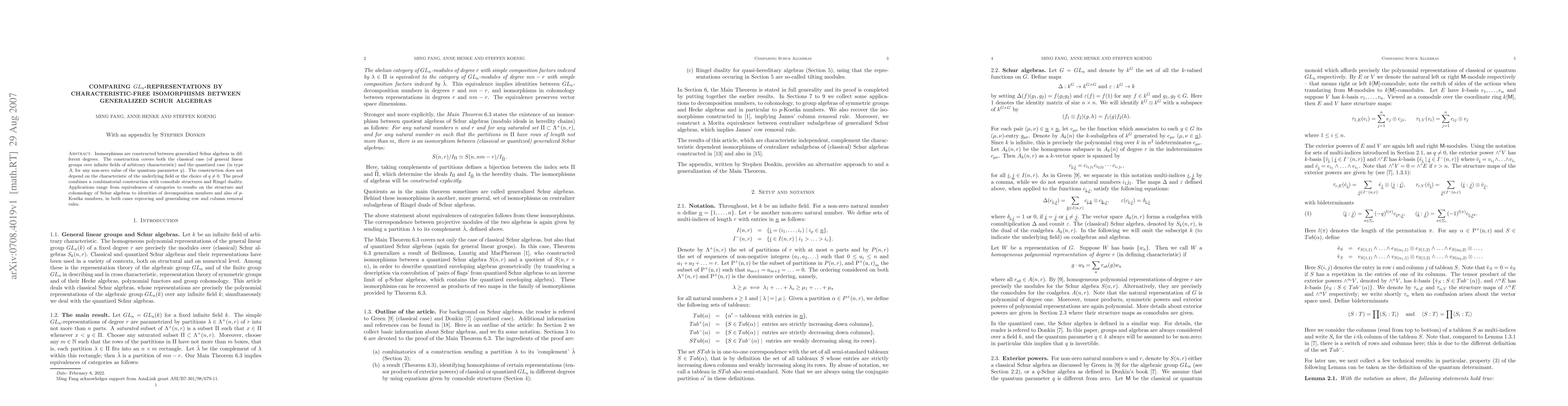 Isomorphisms are constructed between generalized Schur algebras in different degrees. The construction covers both the classical case (of general linear groups over infinite fields of arbitrary characteristic) and the quantized case (in type $A$, for any non-zero value of the quantum parameter $q$). The construction does not depend on the characteristic of the underlying field or the choice of $q \neq 0$. The proof combines a combinatorial construction with comodule structures and Ringel duality. Applications range from equivalences of categories to results on the structure and cohomology of Schur algebras to identities of decomposition numbers and also of $p$-Kostka numbers, in both cases reproving and generalizing row and column removal rules.