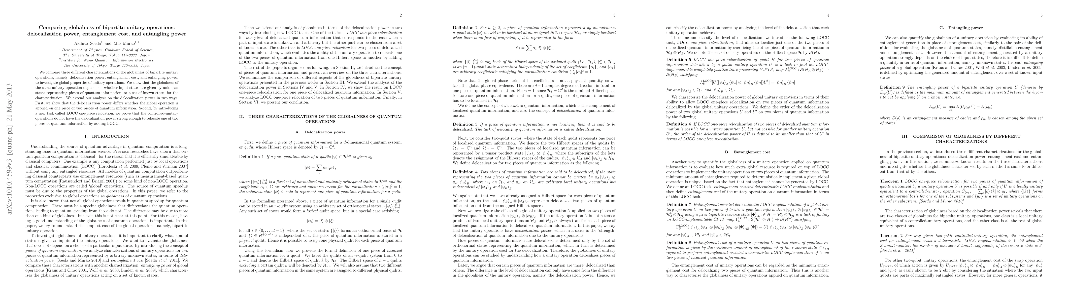 This paper compares the globalness of bipartite unitary operations through delocalization power, entanglement cost, and entangling power, revealing that the globalness varies based on input state knowledge. It also demonstrates that delocalization power differs when applied to one versus two pieces of quantum information and introduces LOCC one-piece relocation to show controlled-unitary operations lack sufficient delocalization power for relocating quantum information.