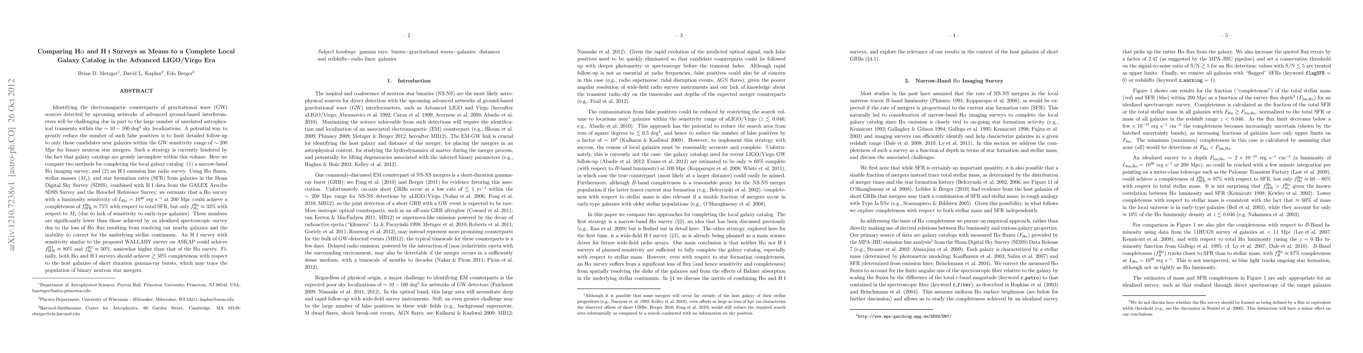 Identifying the electromagnetic counterparts of gravitational wave (GW) sources detected by upcoming networks of advanced ground-based interferometers will be challenging due in part to the large number of unrelated astrophysical transients within the ~10-100 square degree sky localizations. A potential way to greatly reduce the number of such false positives is to limit detailed follow-up to only those candidates near galaxies within the GW sensitivity range of ~200 Mpc for binary neutron star mergers. Such a strategy is currently hindered by the fact that galaxy catalogs are grossly incomplete within this volume. Here we compare two methods for completing the local galaxy catalog: (1) a narrow-band H-alpha imaging survey; and (2) an HI emission line radio survey. Using H-alpha fluxes, stellar masses (M_star), and star formation rates (SFR) from galaxies in the Sloan Digital Sky Survey (SDSS), combined with HI data from the GALEX Arecibo SDSS Survey and the Herschel Reference Survey, we estimate that a H-alpha survey with a luminosity sensitivity of L_H-alpha = 1e40 erg/s at 200 Mpc could achieve a completeness of f_SFR ~ 75% with respect to total SFR, but only f_Mstar ~ 33% with respect to stellar mass (due to lack of sensitivity to early-type galaxies). These numbers are significantly lower than those achieved by an idealized spectroscopic survey due to the loss of H-alpha flux resulting from resolving out nearby galaxies and the inability to correct for the underlying stellar continuum. An HI survey with sensitivity similar to the proposed WALLABY survey on ASKAP could achieve f_SFR ~ 80% and f_Mstar ~ 50%, somewhat higher than that of the H-alpha survey. Finally, both H-alpha and HI surveys should achieve > 50% completeness with respect to the host galaxies of short duration gamma-ray bursts, which may trace the population of binary neutron star mergers.