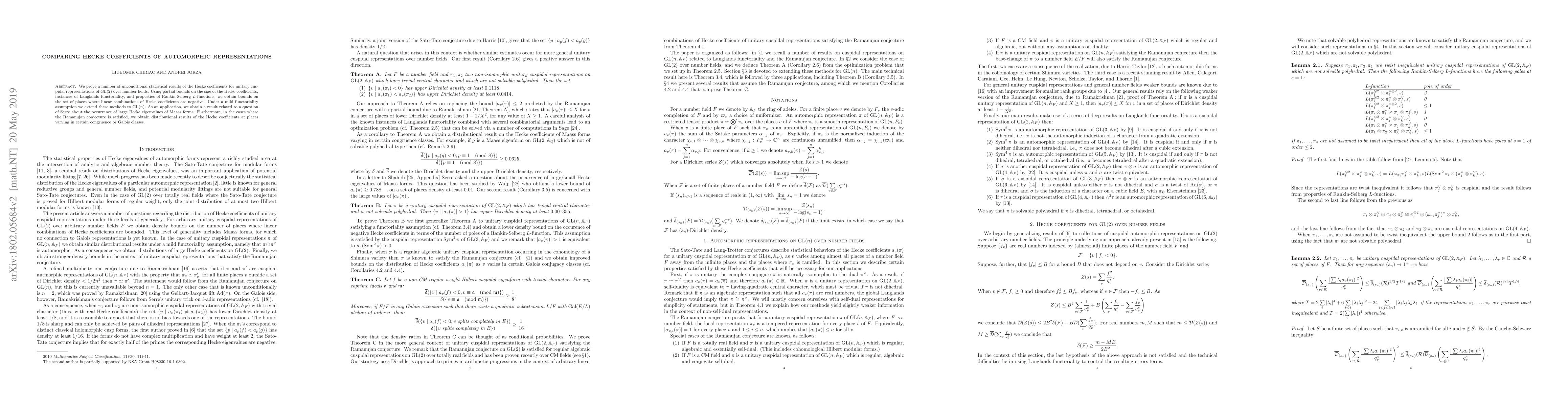 This paper proves statistical results on the Hecke coefficients for unitary cuspidal representations of $\operatorname{GL}(2)$ over number fields, establishing bounds on negative linear combinations and extending methods to $\operatorname{GL}(n)$ under a mild assumption. It also addresses Serre's question on large Hecke eigenvalues and provides distributional results for coefficients satisfying the Ramanujan conjecture.