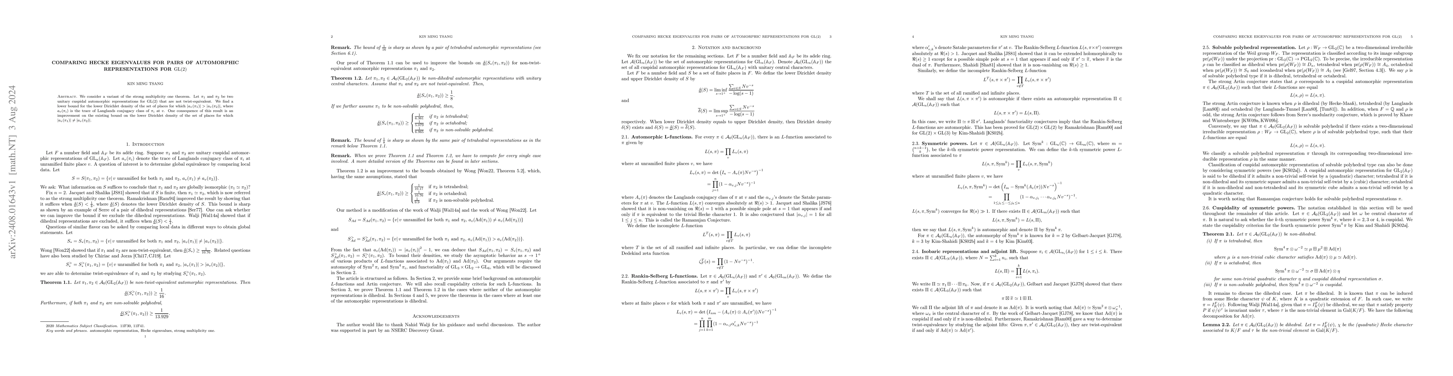 We consider a variant of the strong multiplicity one theorem. Let $\pi_{1}$ and $\pi_{2}$ be two unitary cuspidal automorphic representations for $\mathrm{GL(2)}$ that are not twist-equivalent. We find a lower bound for the lower Dirichlet density of the set of places for which $\left\lvert a_{v}(\pi_{1}) \right\rvert > \left\lvert a_{v}(\pi_{2}) \right\rvert$, where $a_{v}(\pi_{i})$ is the trace of Langlands conjugacy class of $\pi_{i}$ at $v$. One consequence of this result is an improvement on the existing bound on the lower Dirichlet density of the set of places for which $\left\lvert a_{v}(\pi_{1})\right\rvert \neq \left\lvert a_{v}(\pi_{2}) \right\rvert$.