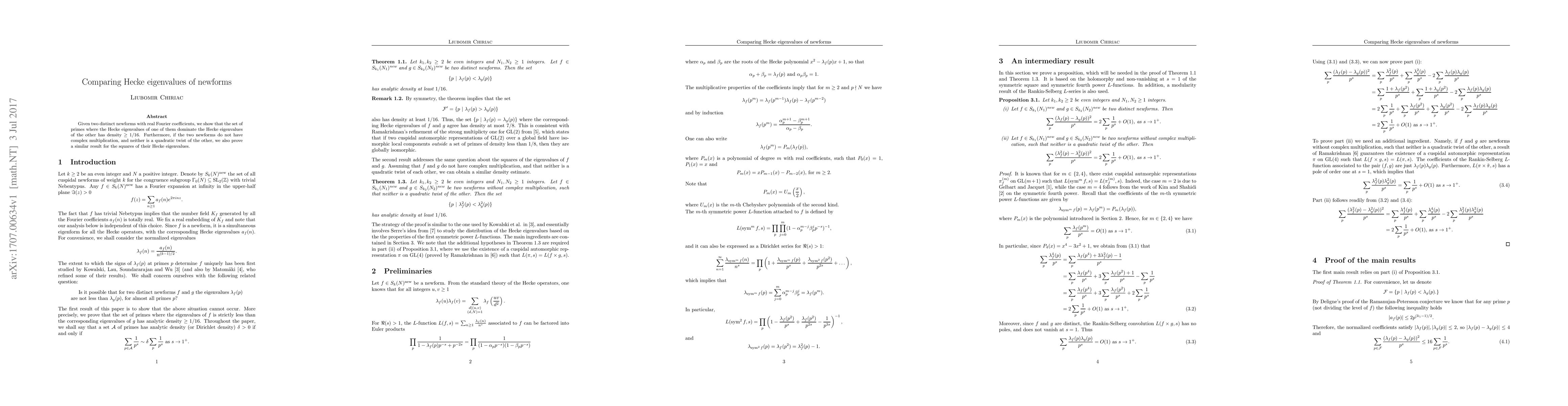 The paper demonstrates that for two distinct newforms with real Fourier coefficients, the primes where one newform's Hecke eigenvalues dominate the other's have a density of at least 1/16. Additionally, if neither newform has complex multiplication and neither is a quadratic twist of the other, a similar result holds for their Hecke eigenvalue squares.