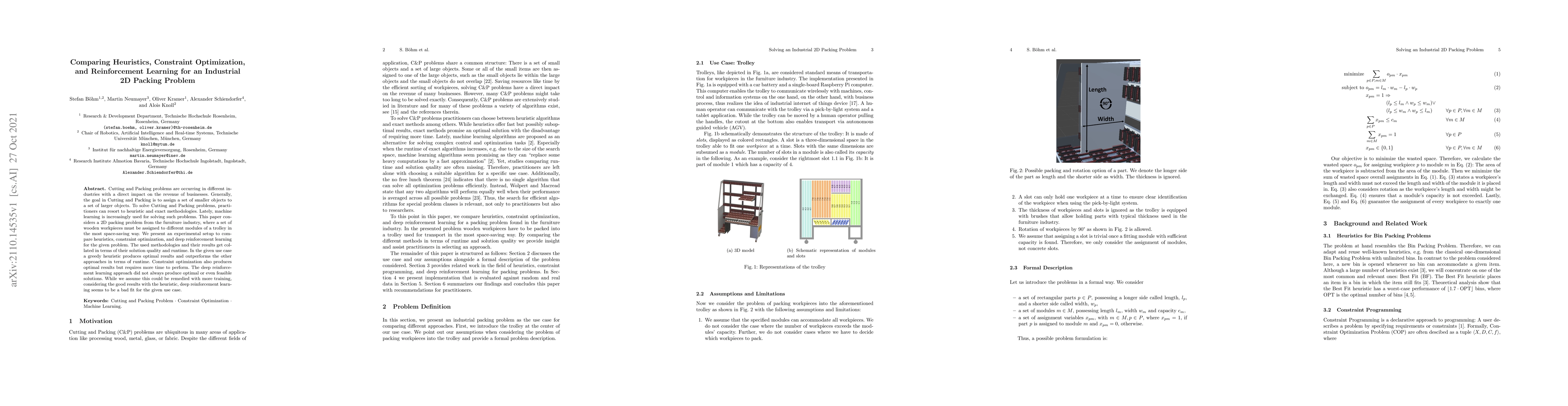 This paper compares heuristics, constraint optimization, and deep reinforcement learning for a 2D packing problem in the furniture industry. A greedy heuristic produced optimal results and outperformed other methods in runtime, while constraint optimization also achieved optimality but was slower. Deep reinforcement learning often failed to produce feasible solutions, indicating it may not be suitable for this specific problem despite potential improvements with more training.
