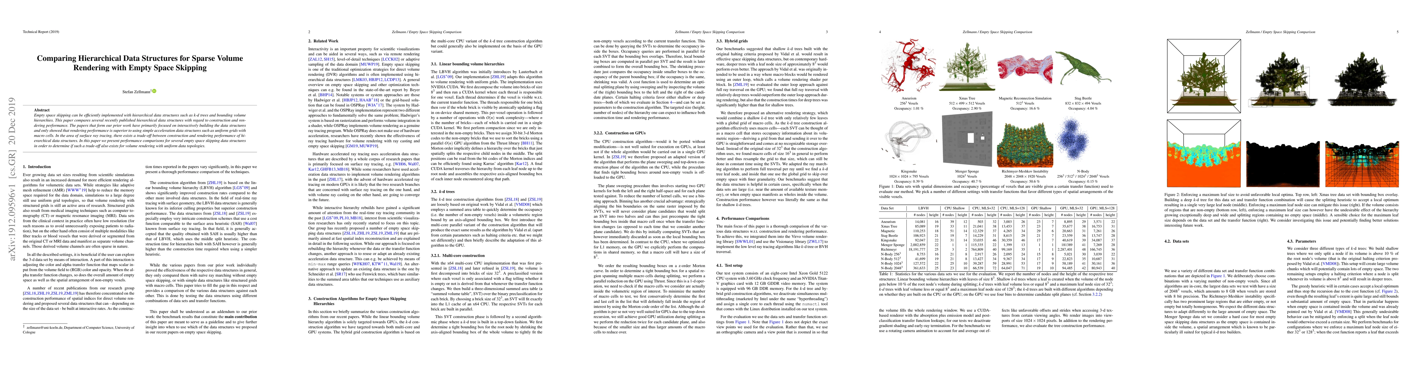 This paper compares various hierarchical data structures like k-d trees and bounding volume hierarchies for efficient sparse volume rendering with empty space skipping. It investigates whether a trade-off between construction and rendering performance exists for volume rendering, extending beyond previous work focused on surface ray tracing.