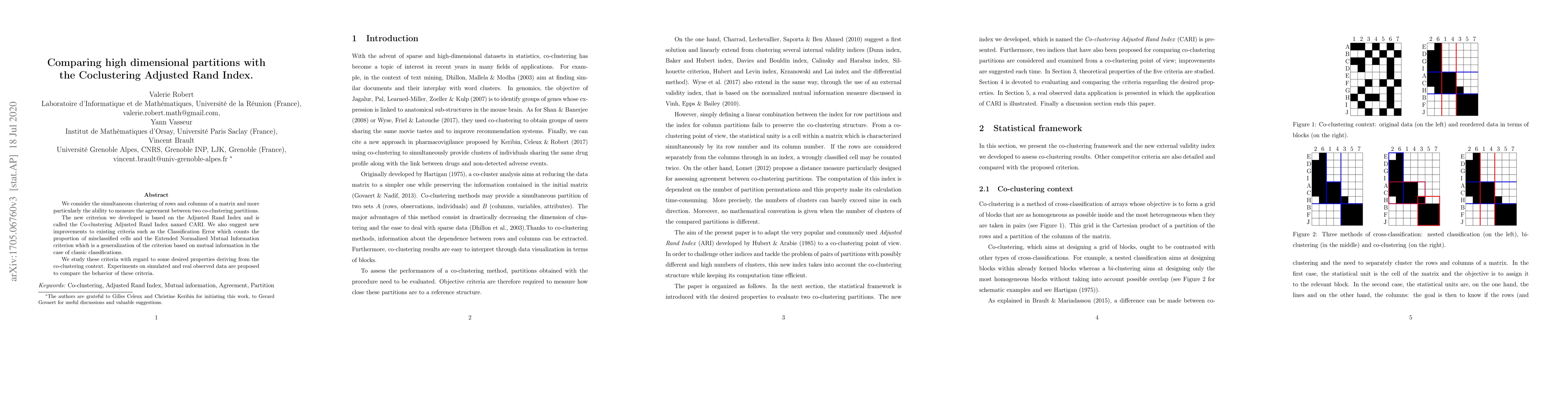 We consider the simultaneous clustering of rows and columns of a matrix and more particularly the ability to measure the agreement between two co-clustering partitions. The new criterion we developed is based on the Adjusted Rand Index and is called the Co-clustering Adjusted Rand Index named CARI. We also suggest new improvements to existing criteria such as the Classification Error which counts the proportion of misclassified cells and the Extended Normalized Mutual Information criterion which is a generalization of the criterion based on mutual information in the case of classic classifications. We study these criteria with regard to some desired properties deriving from the co-clustering context. Experiments on simulated and real observed data are proposed to compare the behavior of these criteria.