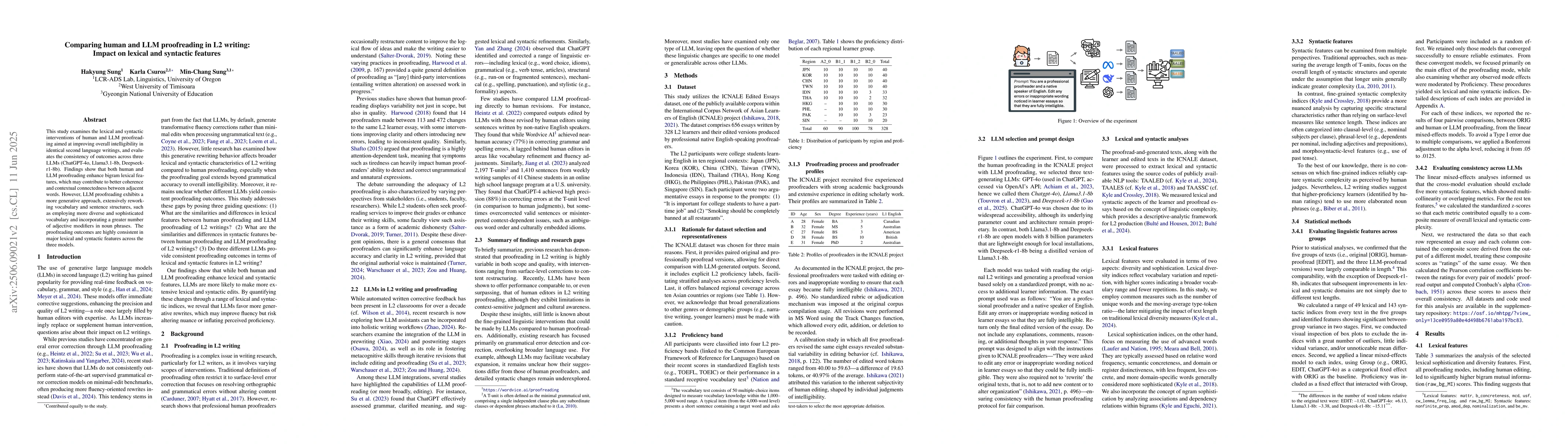 This study examines the lexical and syntactic interventions of human and LLM proofreading aimed at improving overall intelligibility in identical second language writings, and evaluates the consistency of outcomes across three LLMs (ChatGPT-4o, Llama3.1-8b, Deepseek-r1-8b). Findings show that both human and LLM proofreading enhance bigram lexical features, which may contribute to better coherence and contextual connectedness between adjacent words. However, LLM proofreading exhibits a more generative approach, extensively reworking vocabulary and sentence structures, such as employing more diverse and sophisticated vocabulary and incorporating a greater number of adjective modifiers in noun phrases. The proofreading outcomes are highly consistent in major lexical and syntactic features across the three models.