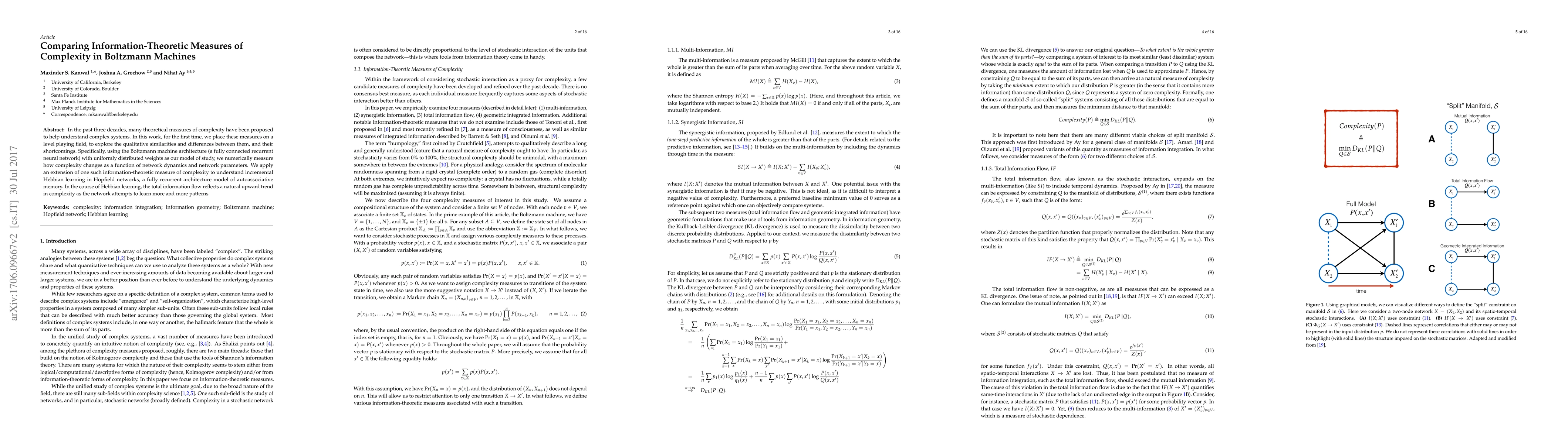 In the past three decades, many theoretical measures of complexity have been proposed to help understand complex systems. In this work, for the first time, we place these measures on a level playing field, to explore the qualitative similarities and differences between them, and their shortcomings. Specifically, using the Boltzmann machine architecture (a fully connected recurrent neural network) with uniformly distributed weights as our model of study, we numerically measure how complexity changes as a function of network dynamics and network parameters. We apply an extension of one such information-theoretic measure of complexity to understand incremental Hebbian learning in Hopfield networks, a fully recurrent architecture model of autoassociative memory. In the course of Hebbian learning, the total information flow reflects a natural upward trend in complexity as the network attempts to learn more and more patterns.