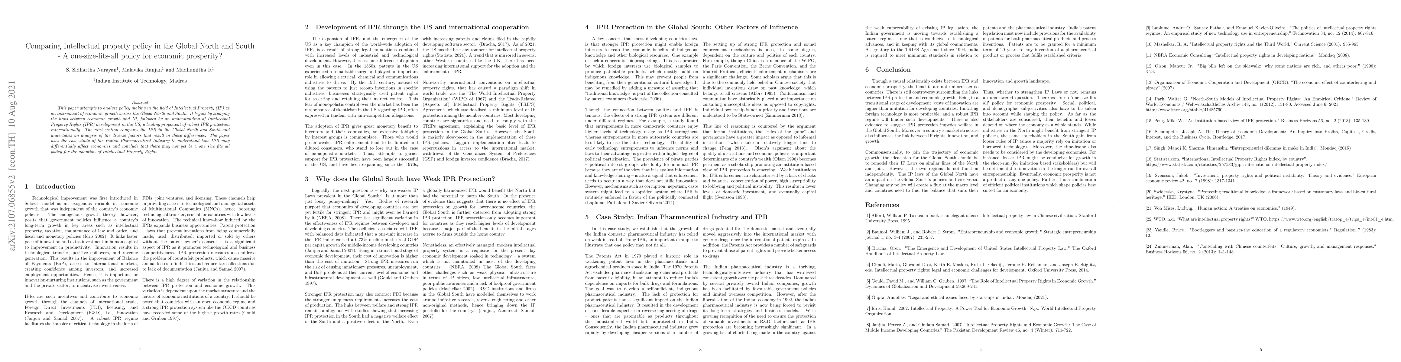 This paper attempts to analyse policymaking in the field of Intellectual Property (IP) as an instrument of economic growth across the Global North and South. It begins by studying the links between economic growth and IP, followed by an understanding of Intellectual Property Rights (IPR) development in the US, a leading proponent of robust IPR protection internationally. The next section compares the IPR in the Global North and South and undertakes an analysis of the diverse factors that result in these differences. The paper uses the case study of the Indian Pharmaceutical Industry to understand how IPR may differentially affect economies and conclude that there may not yet be a one size fits all policy for the adoption of Intellectual Property Rights.