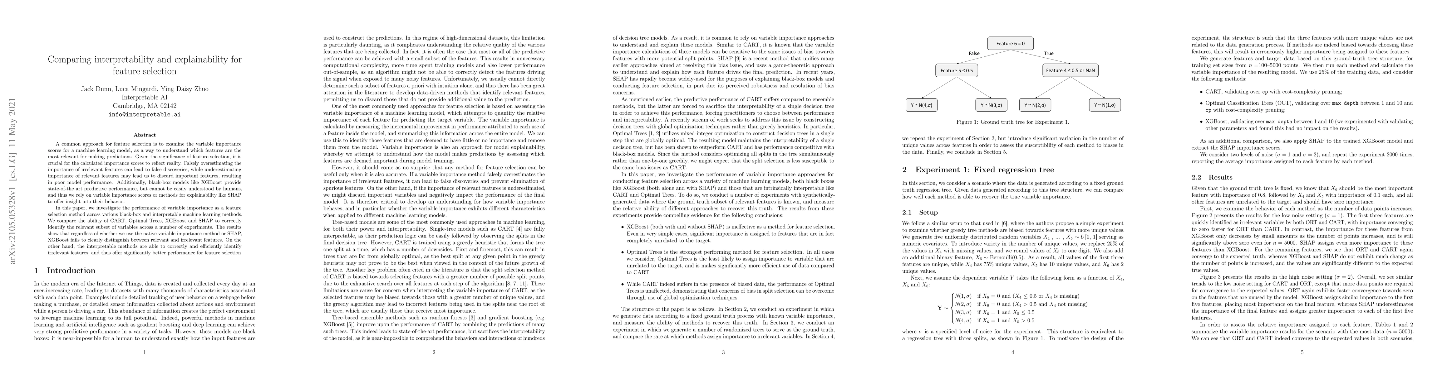 This paper compares feature selection methods across black-box and interpretable machine learning models, finding that while XGBoost excels in predictive performance, it struggles to distinguish relevant from irrelevant features. In contrast, interpretable methods like CART and Optimal Trees effectively identify irrelevant features, leading to better feature selection outcomes.