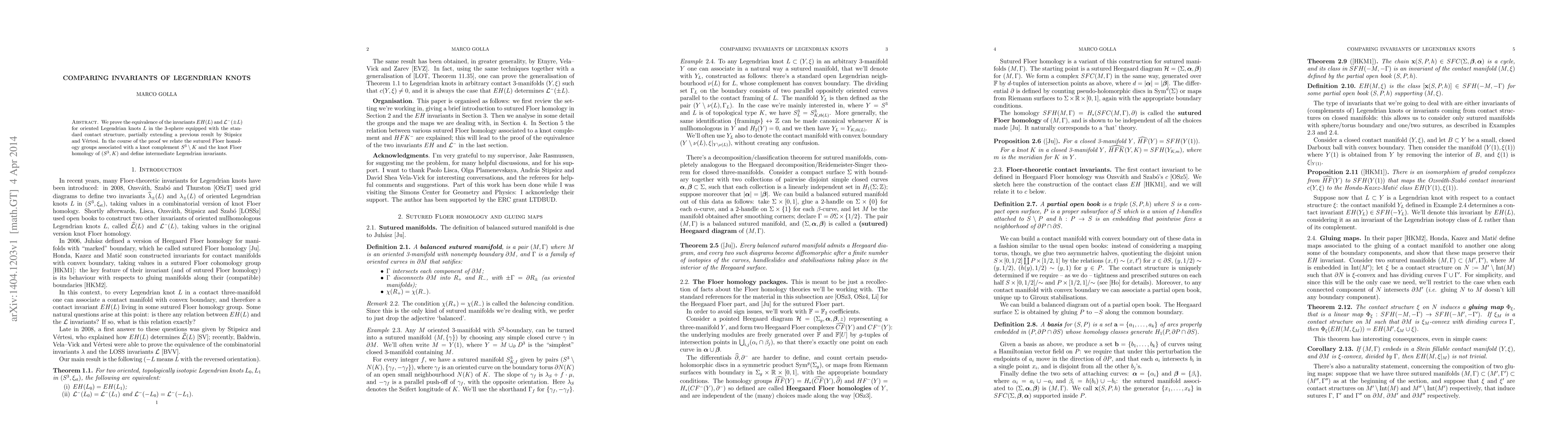 This paper proves the equivalence of the EH(L) and LOSS-(L) invariants for oriented Legendrian knots in the 3-sphere, extending previous results by Stipsicz and Vertesi. It also establishes connections between sutured Floer homology and knot Floer homology, and introduces new intermediate Legendrian invariants.