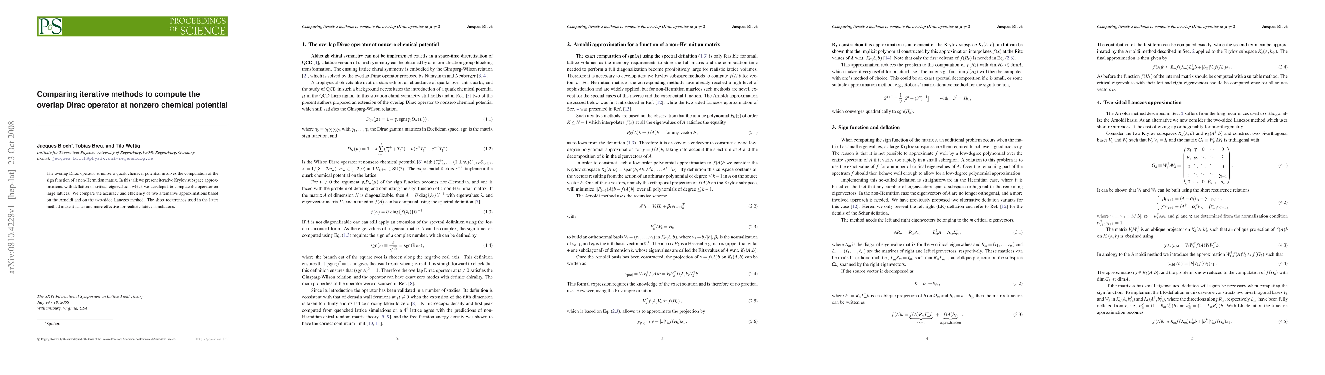 This paper compares iterative Krylov subspace methods, specifically Arnoldi and two-sided Lanczos, for computing the overlap Dirac operator at nonzero chemical potential. The two-sided Lanczos method, due to its shorter recurrences, is found to be more efficient and effective for large lattice simulations.