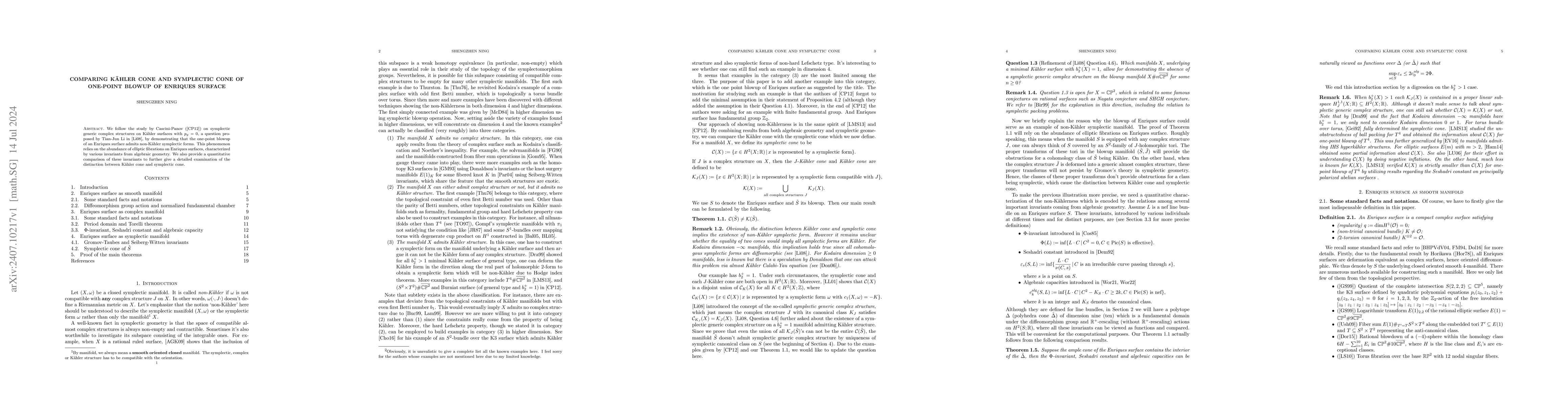 We follow the study by Cascini-Panov on symplectic generic complex structures on Kahler surfaces with $p_g=0$, a question proposed by Tian-Jun Li, by demonstrating that the one-point blowup of an Enriques surface admits non-Kahler symplectic forms. This phenomenon relies on the abundance of elliptic fibrations on Enriques surfaces, characterized by various invariants from algebraic geometry. We also provide a quantitative comparison of these invariants to further give a detailed examination of the distinction between Kahler cone and symplectic cone.