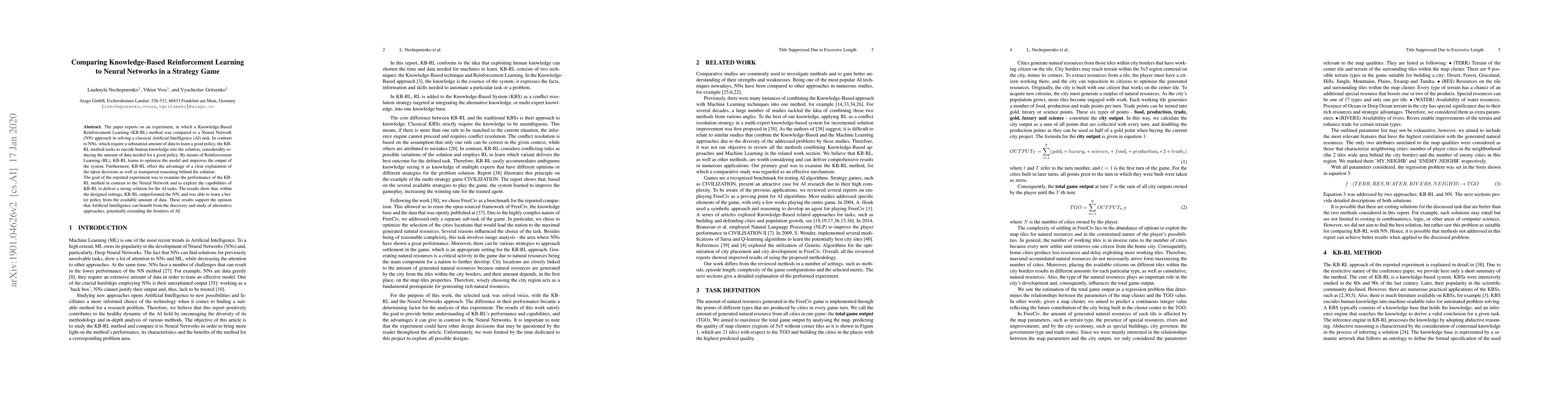 The paper reports on an experiment, in which a Knowledge-Based Reinforcement Learning (KB-RL) method was compared to a Neural Network (NN) approach in solving a classical Artificial Intelligence (AI) task. In contrast to NNs, which require a substantial amount of data to learn a good policy, the KB-RL method seeks to encode human knowledge into the solution, considerably reducing the amount of data needed for a good policy. By means of Reinforcement Learning (RL), KB-RL learns to optimize the model and improves the output of the system. Furthermore, KB-RL offers the advantage of a clear explanation of the taken decisions as well as transparent reasoning behind the solution. The goal of the reported experiment was to examine the performance of the KB-RL method in contrast to the Neural Network and to explore the capabilities of KB-RL to deliver a strong solution for the AI tasks. The results show that, within the designed settings, KB-RL outperformed the NN, and was able to learn a better policy from the available amount of data. These results support the opinion that Artificial Intelligence can benefit from the discovery and study of alternative approaches, potentially extending the frontiers of AI.