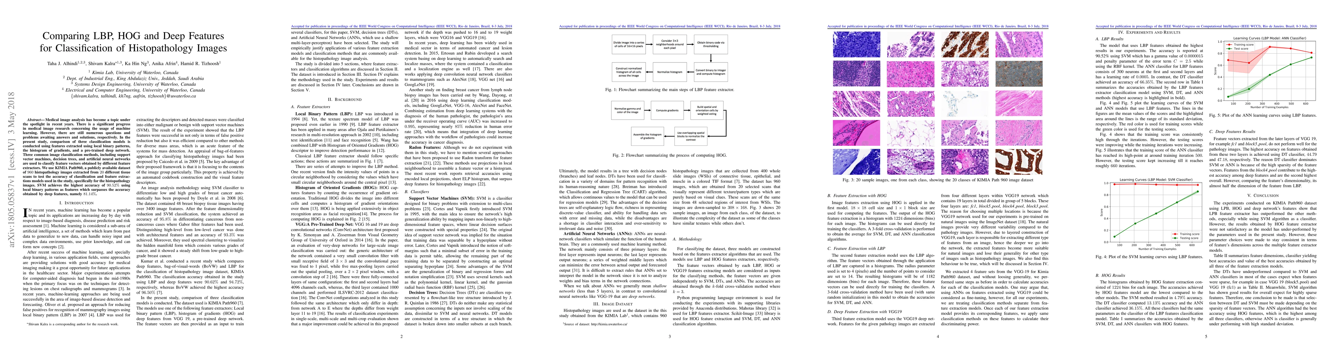 This study compares the performance of local binary patterns, histogram of gradients, and deep features for classifying histopathology images, finding that SVM with local binary patterns achieves the highest accuracy of 90.52%, outperforming deep features.