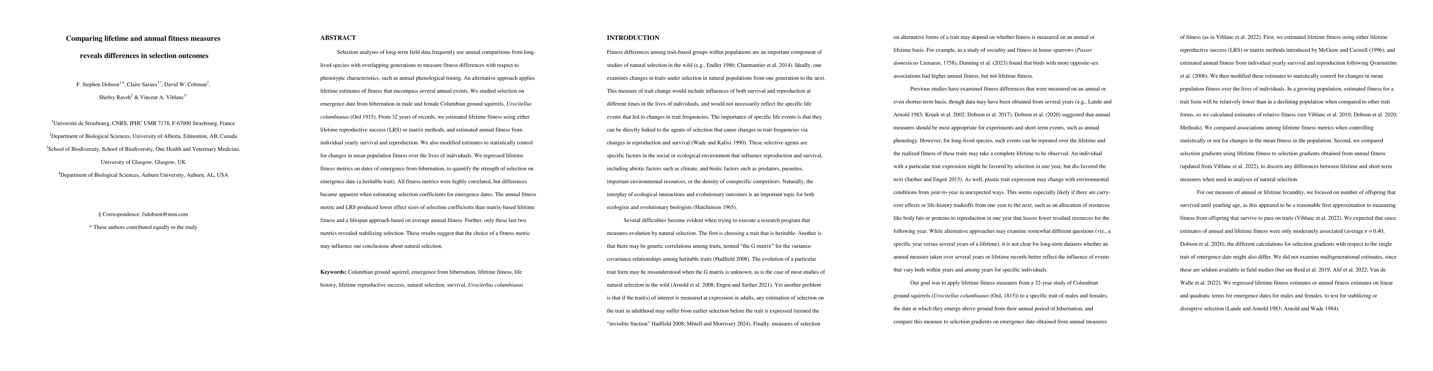 Selection analyses of long-term field data frequently use annual comparisons from longlived species with overlapping generations to measure fitness differences with respect to phenotypic characteristics, such as annual phenological timing. An alternative approach applies lifetime estimates of fitness that encompass several annual events. We studied selection on emergence date from hibernation in male and female Columbian ground squirrels, Urocitellus columbianus (Ord 1915). From 32 years of records, we estimated lifetime fitness using either lifetime reproductive success (LRS) or matrix methods, and estimated annual fitness from individual yearly survival and reproduction. We also modified estimates to statistically control for changes in mean population fitness over the lives of individuals. We regressed lifetime fitness metrics on dates of emergence from hibernation, to quantify the strength of selection on emergence date (a heritable trait). All fitness metrics were highly correlated, but differences became apparent when estimating selection coefficients for emergence dates. The annual fitness metric and LRS produced lower effect sizes of selection coefficients than matrix-based lifetime fitness and a lifespan approach based on average annual fitness. Further, only these last two metrics revealed stabilizing selection. These results suggest that the choice of a fitness metric may influence our conclusions about natural selection.