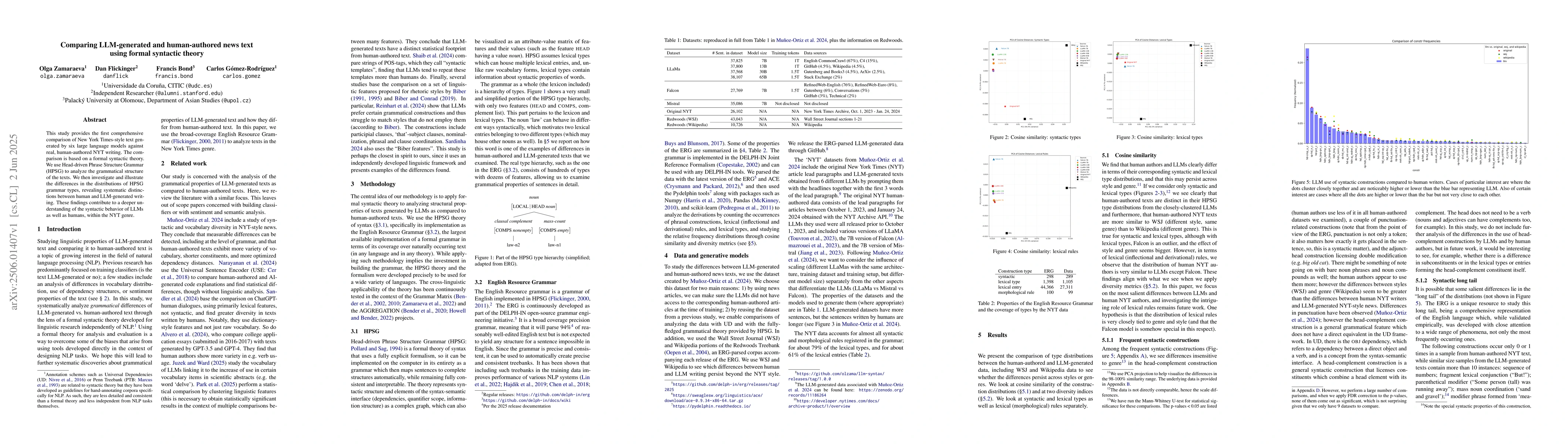 Application of formal syntactic theory (HPSG) to compare LLM-generated and human-authored news texts, revealing distinct syntactic patterns.