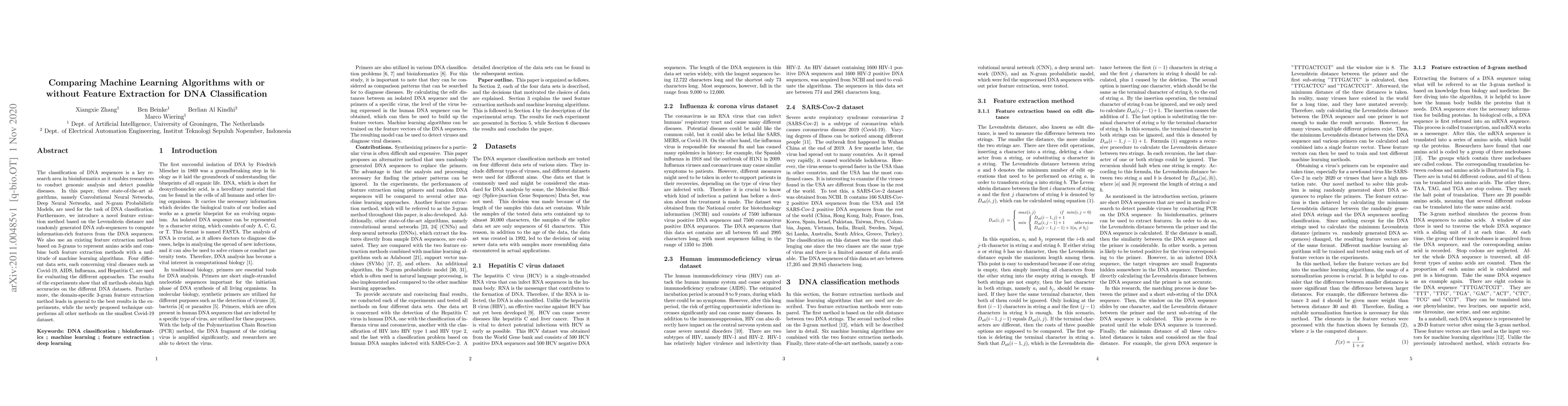 The classification of DNA sequences is a key research area in bioinformatics as it enables researchers to conduct genomic analysis and detect possible diseases. In this paper, three state-of-the-art algorithms, namely Convolutional Neural Networks, Deep Neural Networks, and N-gram Probabilistic Models, are used for the task of DNA classification. Furthermore, we introduce a novel feature extraction method based on the Levenshtein distance and randomly generated DNA sub-sequences to compute information-rich features from the DNA sequences. We also use an existing feature extraction method based on 3-grams to represent amino acids and combine both feature extraction methods with a multitude of machine learning algorithms. Four different data sets, each concerning viral diseases such as Covid-19, AIDS, Influenza, and Hepatitis C, are used for evaluating the different approaches. The results of the experiments show that all methods obtain high accuracies on the different DNA datasets. Furthermore, the domain-specific 3-gram feature extraction method leads in general to the best results in the experiments, while the newly proposed technique outperforms all other methods on the smallest Covid-19 dataset