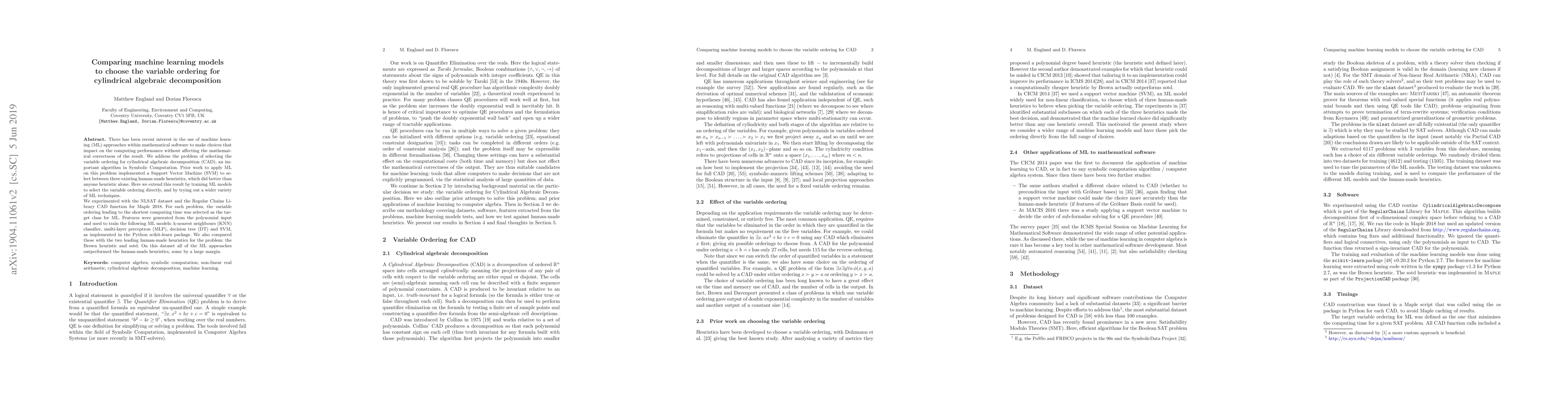 This paper explores the application of various machine learning models to select the optimal variable ordering for cylindrical algebraic decomposition (CAD), an essential algorithm in symbolic computation. The study compares k-nearest neighbours, multi-layer perceptron, decision tree, and SVM models against human-made heuristics, finding that all ML approaches outperform the heuristics, with some showing significant improvements.