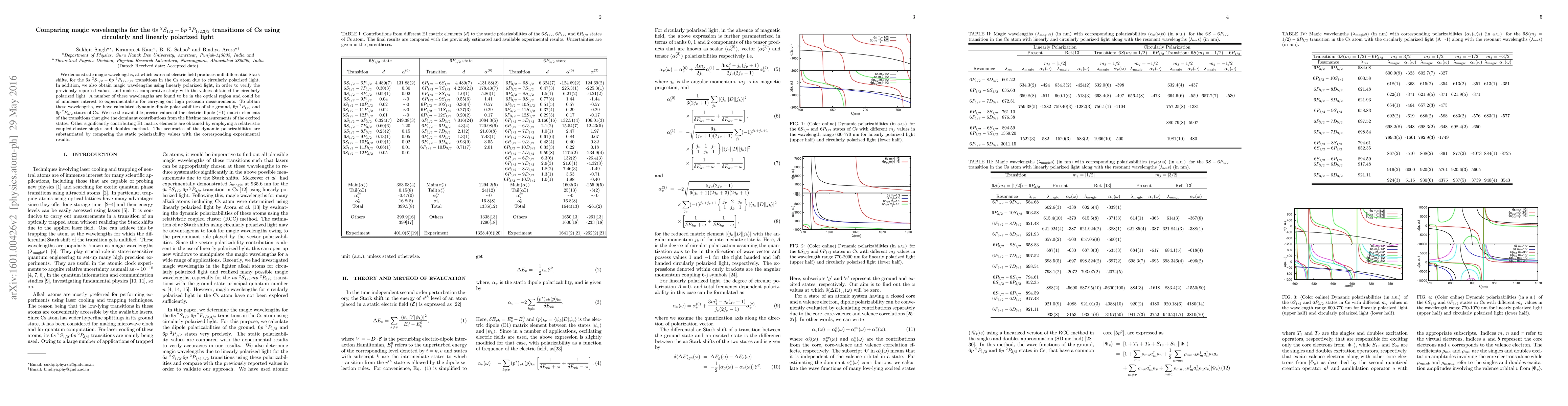 We demonstrate magic wavelengths, at which external electric field produces null differential Stark shifts, for the $6s ~ {^2}S_{1/2}-6p ~ {^2}P_{1/2,3/2}$ transitions in the Cs atom due to circularly polarized light. In addition, we also obtain magic wavelengths using linearly polarized light, in order to verify the previously reported values, and make a comparative study with the values obtained for circularly polarized light. A number of these wavelengths are found to be in the optical region and could be of immense interest to experimentalists for carrying out high precision measurements. To obtain these wavelengths, we have calculated dynamic dipole polarizabilities of the ground, $6p ~{^2}P_{1/2}$ and $6p ~{^2}P_{3/2}$ states of Cs. We use the available precise values of the electric dipole (E1) matrix elements of the transitions that give the dominant contributions from the lifetime measurements of the excited states. Other significantly contributing E1 matrix elements are obtained by employing a relativistic coupled-cluster singles and doubles method. The accuracies of the dynamic polarizabilities are substantiated by comparing the static polarizability values with the corresponding experimental results.