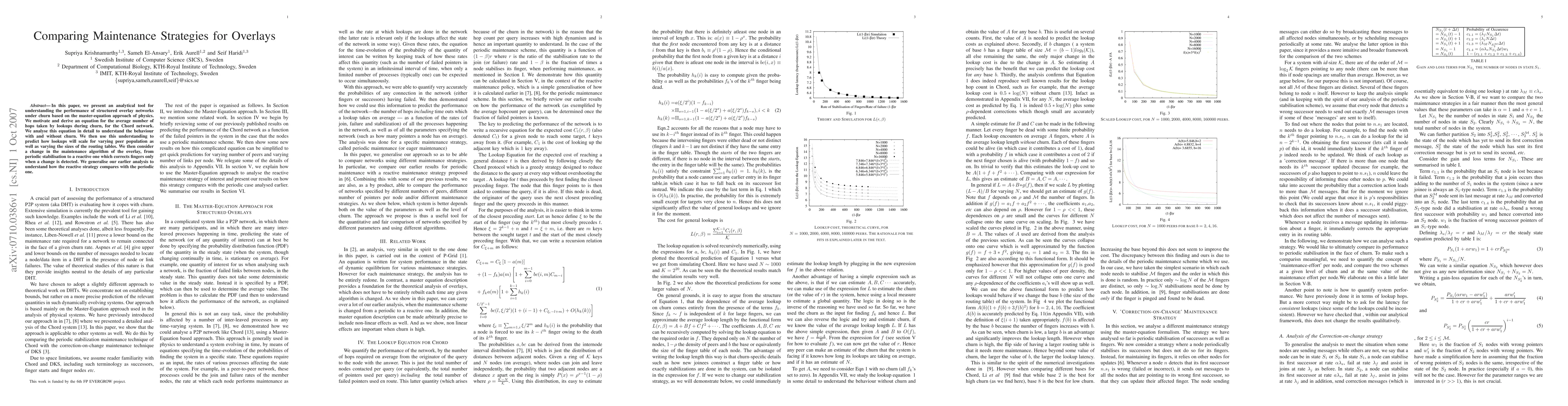 In this paper, we present an analytical tool for understanding the performance of structured overlay networks under churn based on the master-equation approach of physics. We motivate and derive an equation for the average number of hops taken by lookups during churn, for the Chord network. We analyse this equation in detail to understand the behaviour with and without churn. We then use this understanding to predict how lookups will scale for varying peer population as well as varying the sizes of the routing tables. We then consider a change in the maintenance algorithm of the overlay, from periodic stabilisation to a reactive one which corrects fingers only when a change is detected. We generalise our earlier analysis to underdstand how the reactive strategy compares with the periodic one.