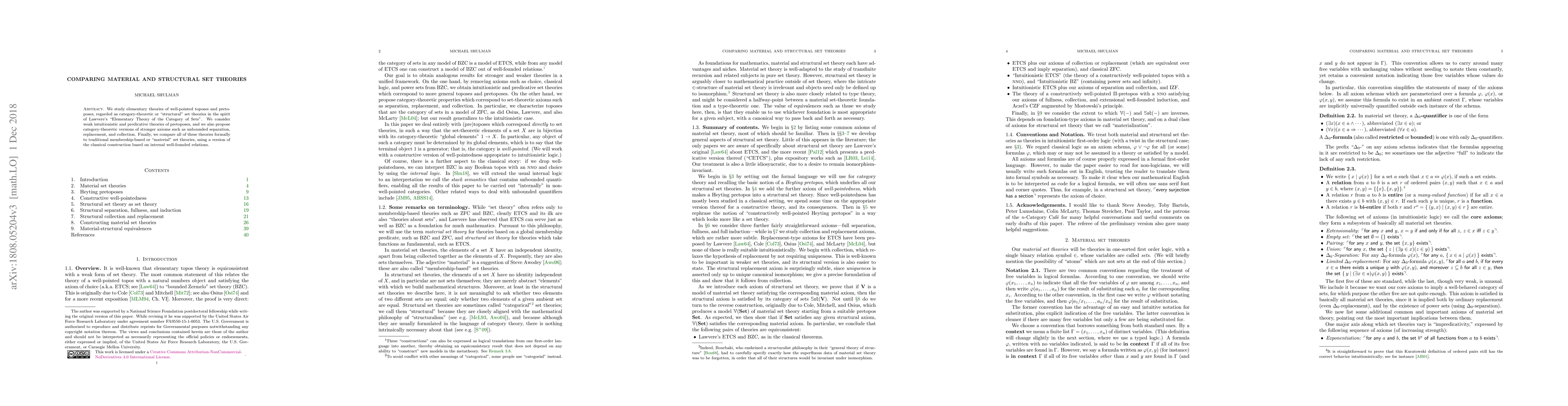 The paper introduces a method to compare material and structural set theories formally, using internal well-founded relations and category-theoretic axioms for stronger set-theoretic principles.