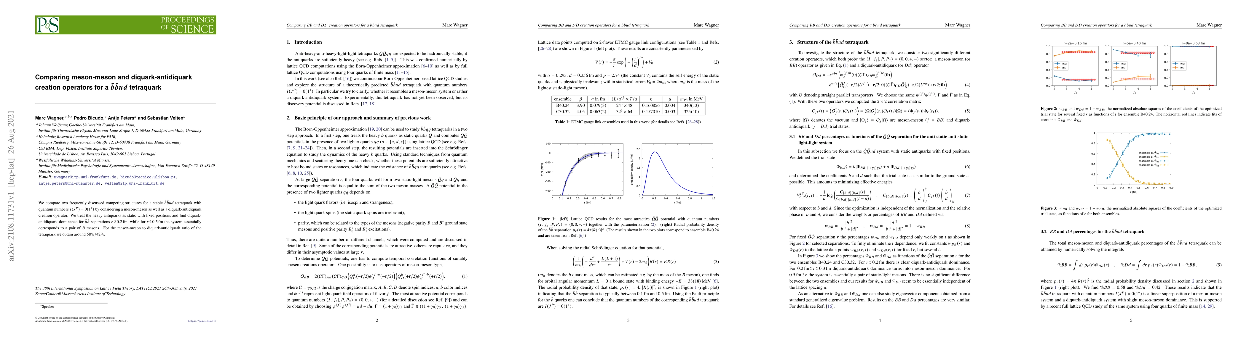 This paper compares two potential structures for a $\bar b \bar b u d$ tetraquark, finding that diquark-antidiquark configurations dominate for short distances, while meson-meson configurations prevail at larger separations, with a ratio of approximately 58% meson-meson to 42% diquark-antidiquark.