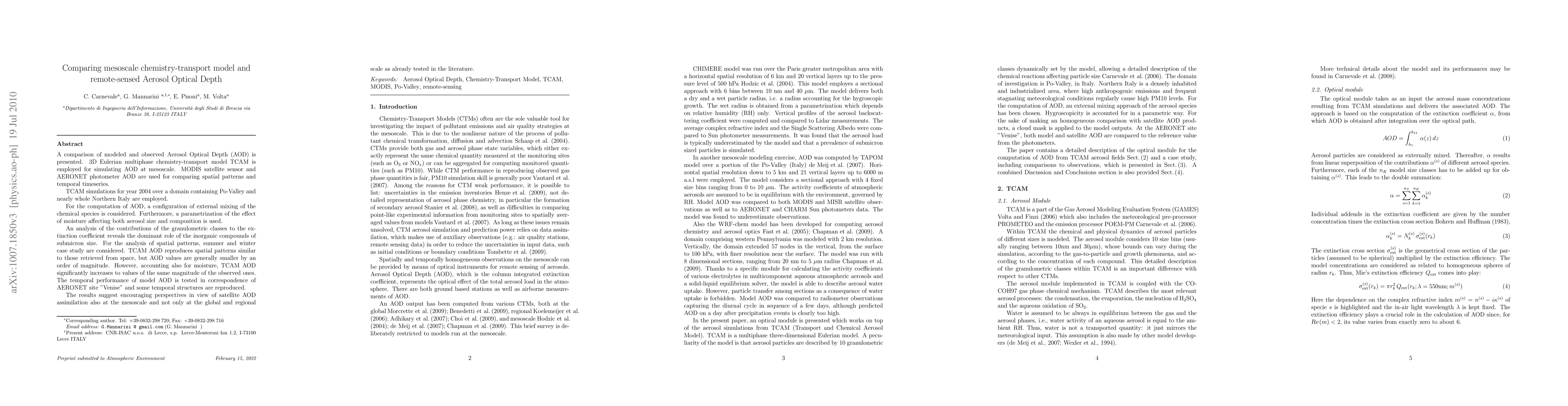 This study compares the aerosol optical depth (AOD) from a mesoscale chemistry-transport model (TCAM) with remote-sensed AOD from MODIS and AERONET. The TCAM model, configured with external mixing and moisture effects, simulates AOD over Northern Italy in 2004, showing improved agreement with observations when moisture is considered.