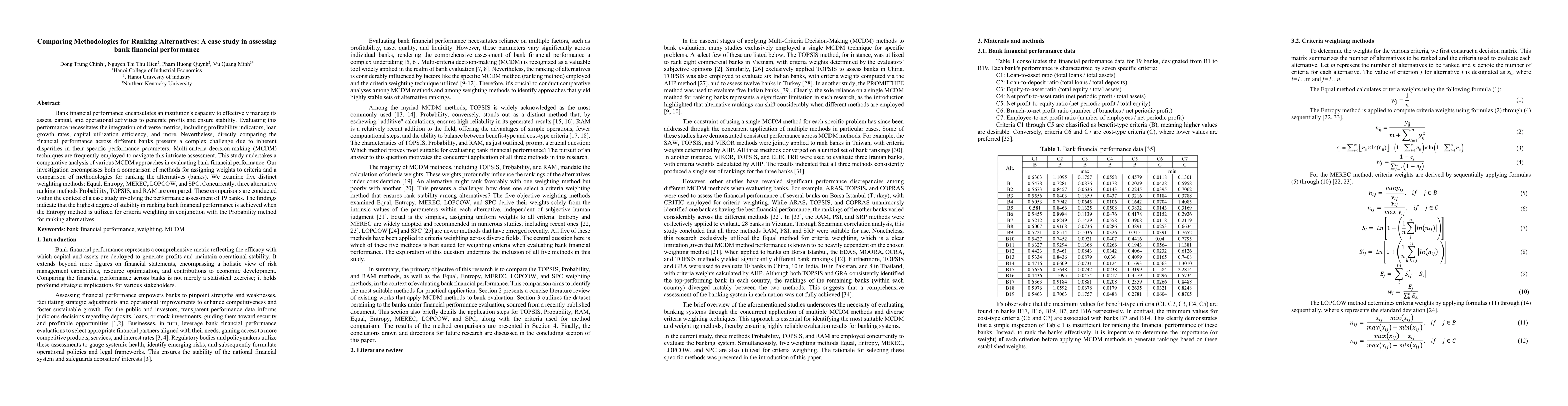 Bank financial performance encapsulates an institution's capacity to effectively manage its assets, capital, and operational activities to generate profits and ensure stability. Evaluating this performance necessitates the integration of diverse metrics, including profitability indicators, loan growth rates, capital utilization efficiency, and more. Nevertheless, directly comparing the financial performance across different banks presents a complex challenge due to inherent disparities in their specific performance parameters. Multi-criteria decision-making (MCDM) techniques are frequently employed to navigate this intricate assessment. This study undertakes a comparative analysis of various MCDM approaches in evaluating bank financial performance. Our investigation encompasses both a comparison of methods for assigning weights to criteria and a comparison of methodologies for ranking the alternatives (banks). We examine five distinct weighting methods: Equal, Entropy, MEREC, LOPCOW, and SPC. Concurrently, three alternative ranking methods Probability, TOPSIS, and RAM are compared. These comparisons are conducted within the context of a case study involving the performance assessment of 19 banks. The findings indicate that the highest degree of stability in ranking bank financial performance is achieved when the Entropy method is utilized for criteria weighting in conjunction with the Probability method for ranking alternatives.
