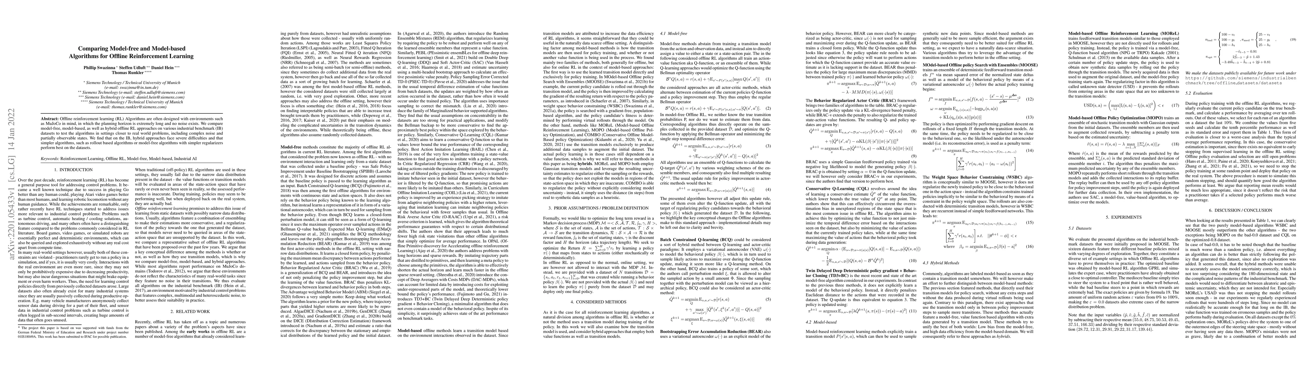 Researchers compared model-free, model-based, and hybrid offline reinforcement learning algorithms on industrial datasets with complex noise and partially observable states. They found that simpler algorithms performed best, highlighting the challenges of applying traditional methods to real-world problems.