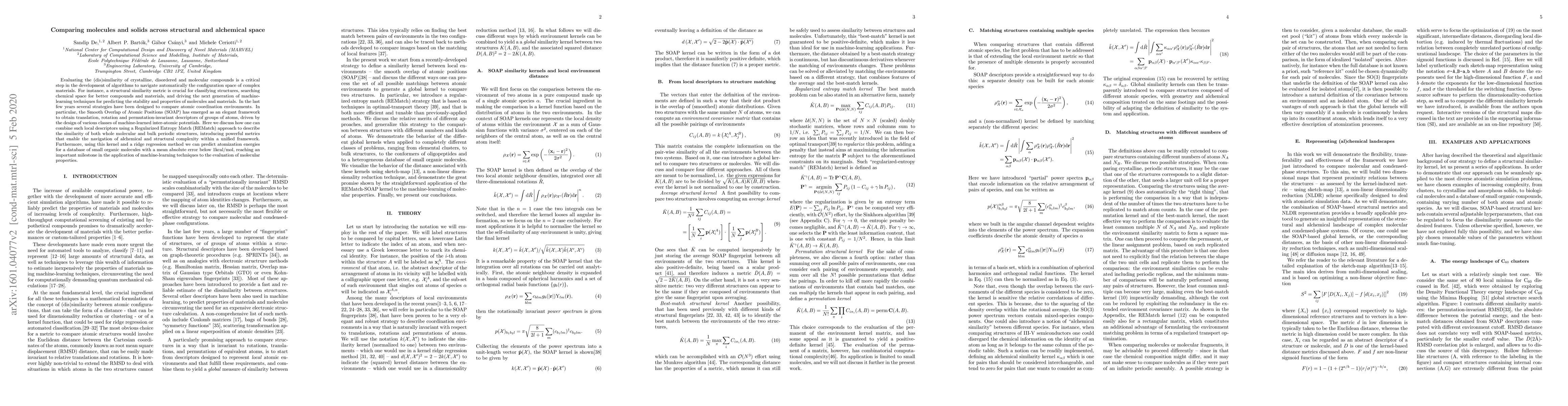 This paper introduces a novel approach to compare the structural and alchemical similarity of molecules and solids using the Smooth Overlap of Atomic Positions (SOAP) and Regularized Entropy Match (REMatch) frameworks. It demonstrates the effectiveness of these methods in predicting atomization energies for small organic molecules with high accuracy.