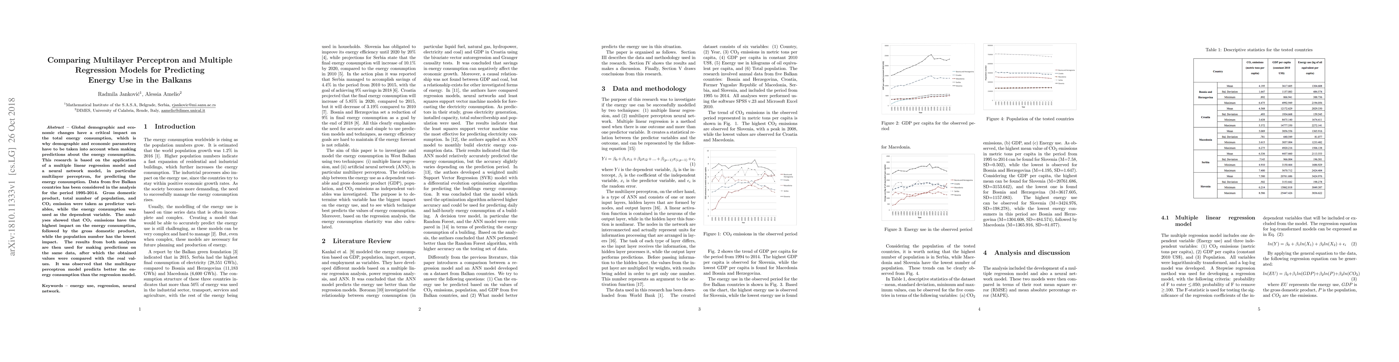 This study compares the predictive accuracy of multilayer perceptron neural networks and multiple regression models for forecasting energy consumption in five Balkan countries from 1995-2014. The results show that CO2 emissions and GDP are the most influential predictors, with MLP outperforming regression in prediction accuracy.