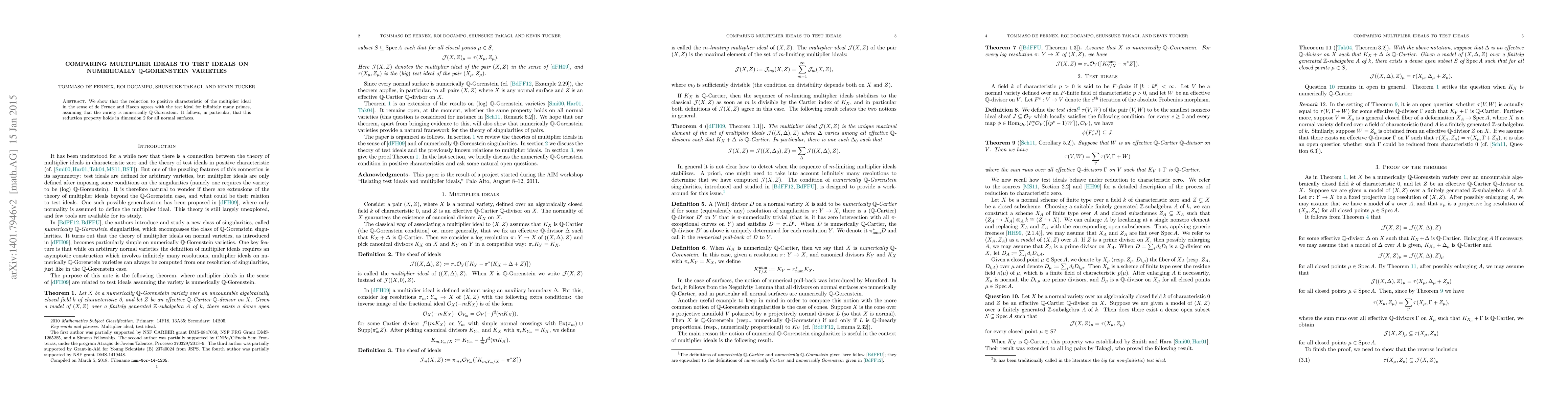 Researchers show that for infinitely many primes, the reduction of a multiplier ideal to positive characteristic agrees with the test ideal on numerically Q-Gorenstein varieties, particularly in dimension 2.