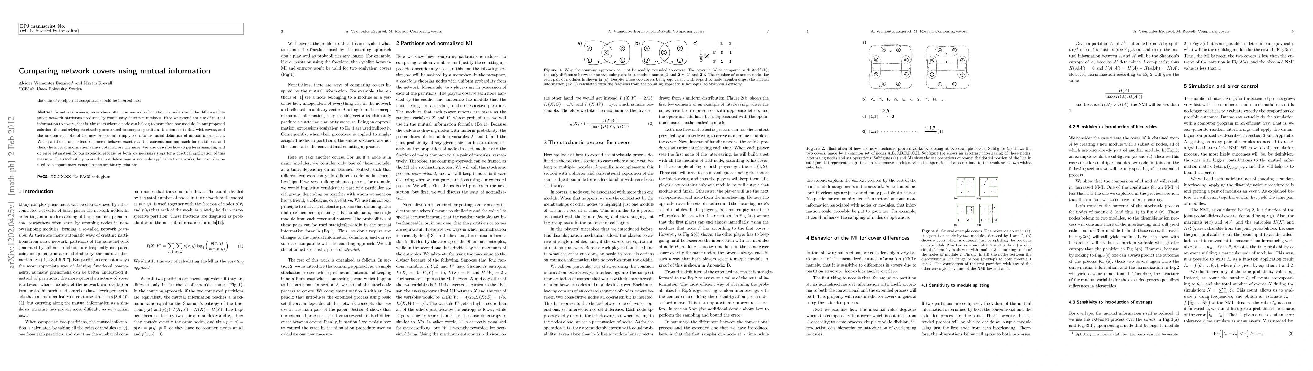 This paper extends mutual information to compare network covers, where nodes can belong to multiple modules, using a modified stochastic process. The extended process maintains consistency with conventional mutual information for partitions and includes methods for sampling and error estimation for practical application.