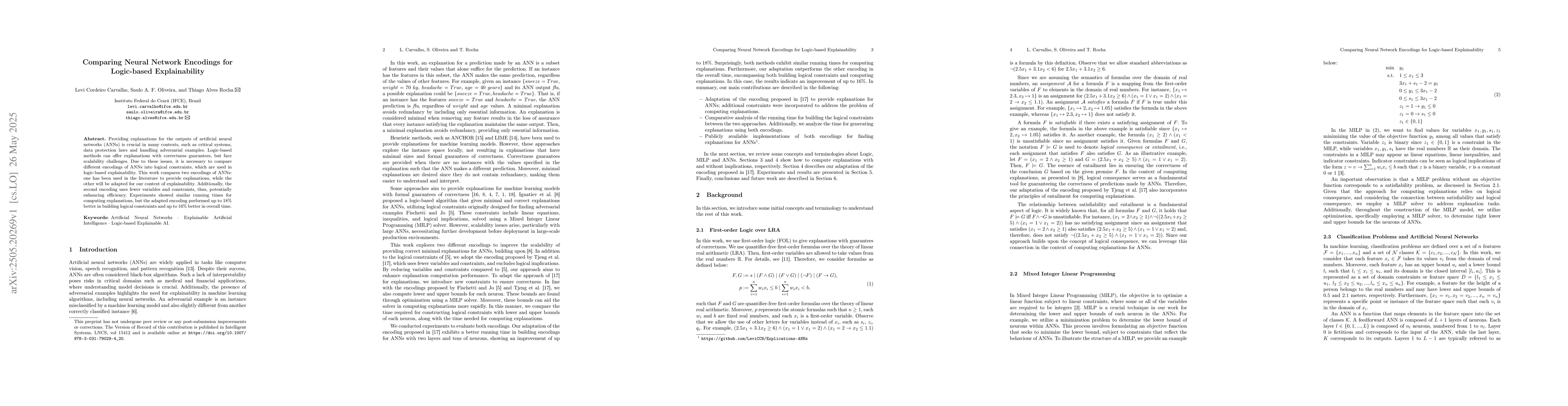 This research differentiates itself by adapting an existing encoding for enhanced performance in building logical constraints for explainability, offering a more efficient alternative to previous methods.