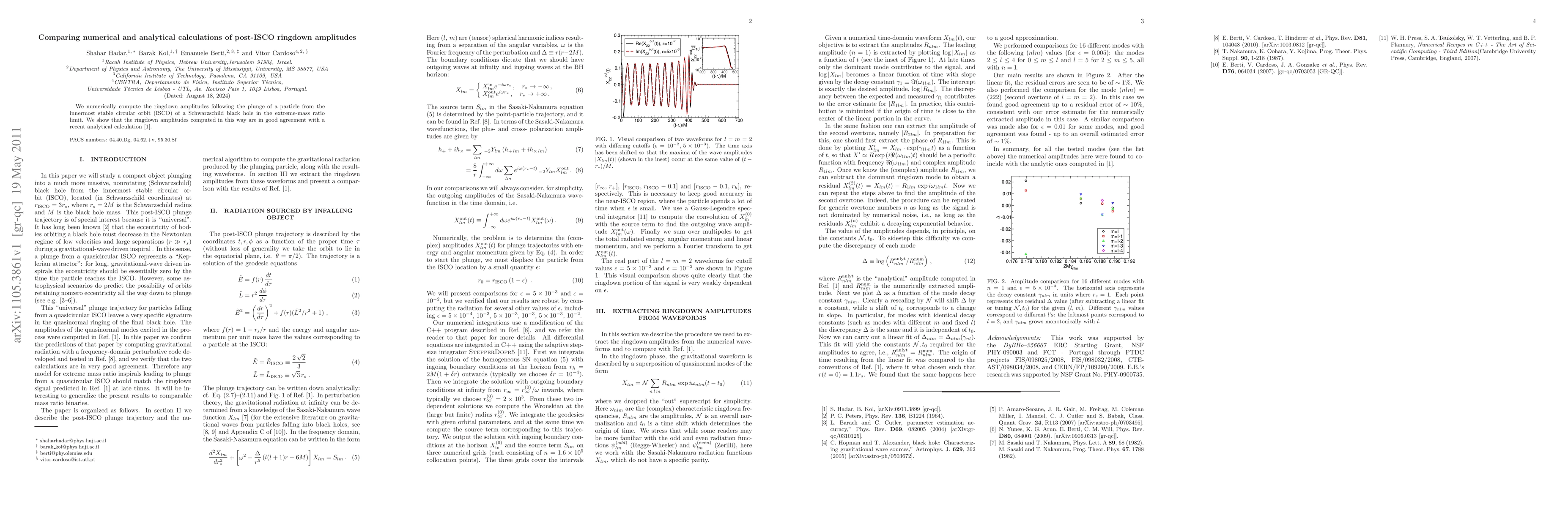This paper compares numerical simulations of post-ISCO ringdown amplitudes from a Schwarzschild black hole with recent analytical calculations, finding strong agreement between the two methods. The study focuses on the extreme-mass ratio limit and validates the analytical model through numerical computations.