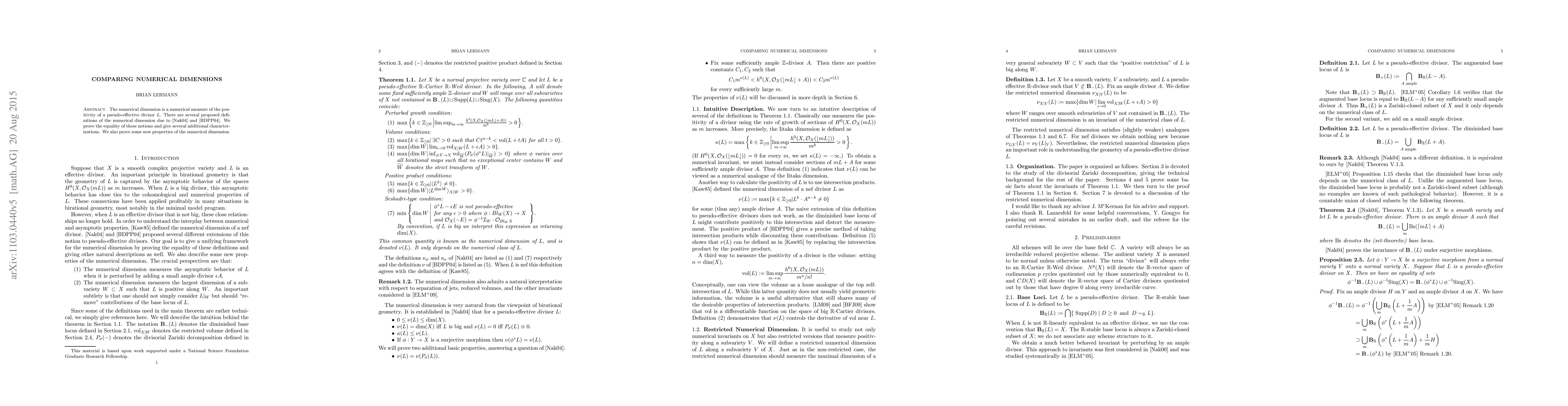 The numerical dimension is a numerical measure of the positivity of a pseudo-effective divisor $L$. There are several proposed definitions of the numerical dimension due to Nakayama (2004) and Boucksom et al. (2004). We prove the equality of these notions and give several additional characterizations. We also prove some new properties of the numerical dimension.
