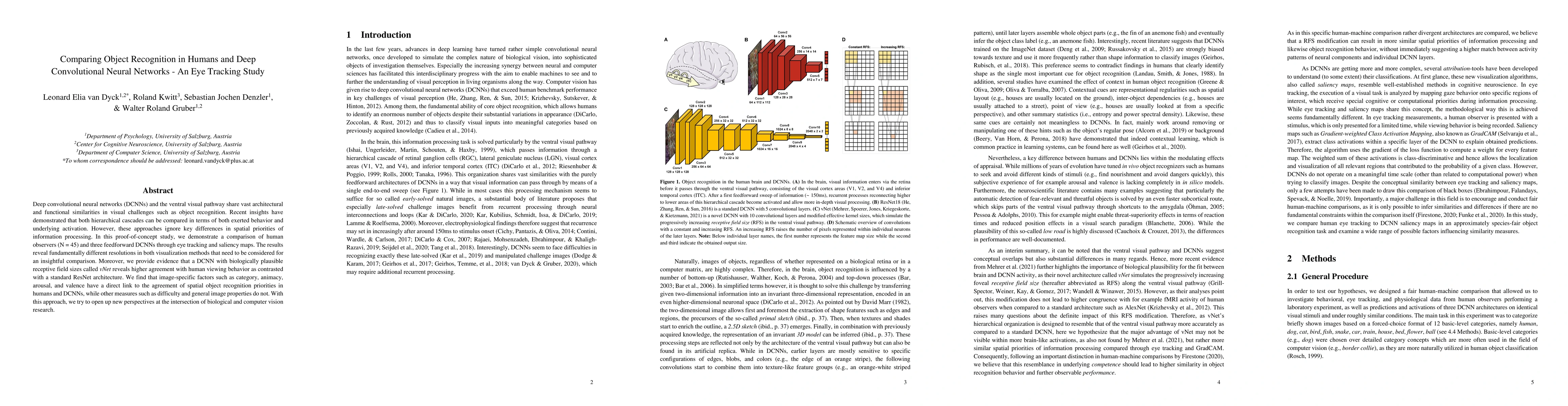 This study compares human object recognition with deep convolutional neural networks (DCNNs) using eye tracking, revealing different spatial processing priorities. The vNet DCNN, with biologically plausible receptive fields, shows higher agreement with human viewing behavior compared to standard ResNet, highlighting the influence of image-specific factors like category and animacy on recognition agreement.