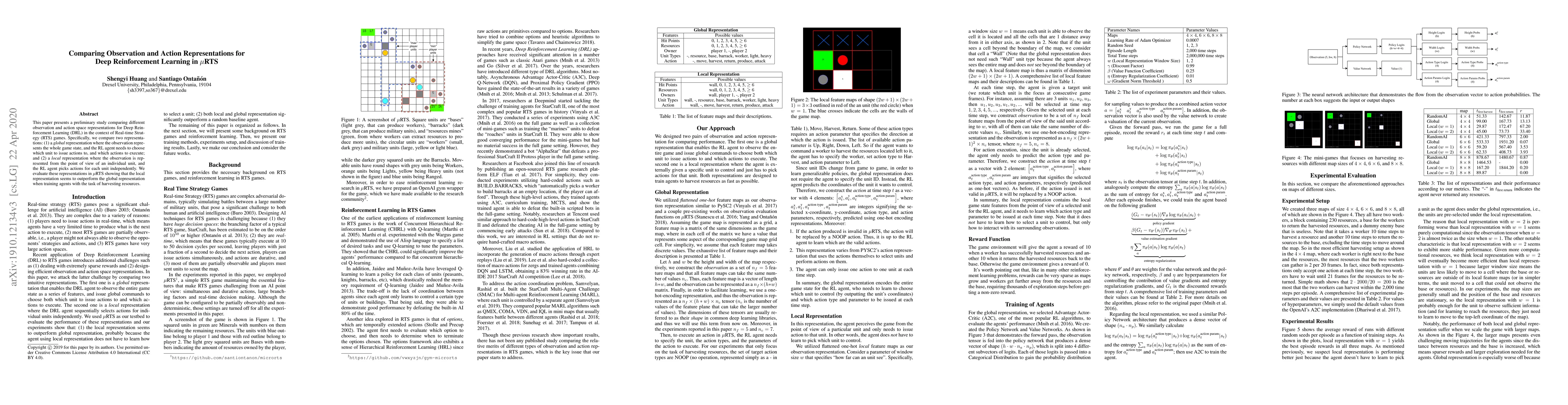 This paper presents a preliminary study comparing different observation and action space representations for Deep Reinforcement Learning (DRL) in the context of Real-time Strategy (RTS) games. Specifically, we compare two representations: (1) a global representation where the observation represents the whole game state, and the RL agent needs to choose which unit to issue actions to, and which actions to execute; and (2) a local representation where the observation is represented from the point of view of an individual unit, and the RL agent picks actions for each unit independently. We evaluate these representations in $\mu$RTS showing that the local representation seems to outperform the global representation when training agents with the task of harvesting resources.