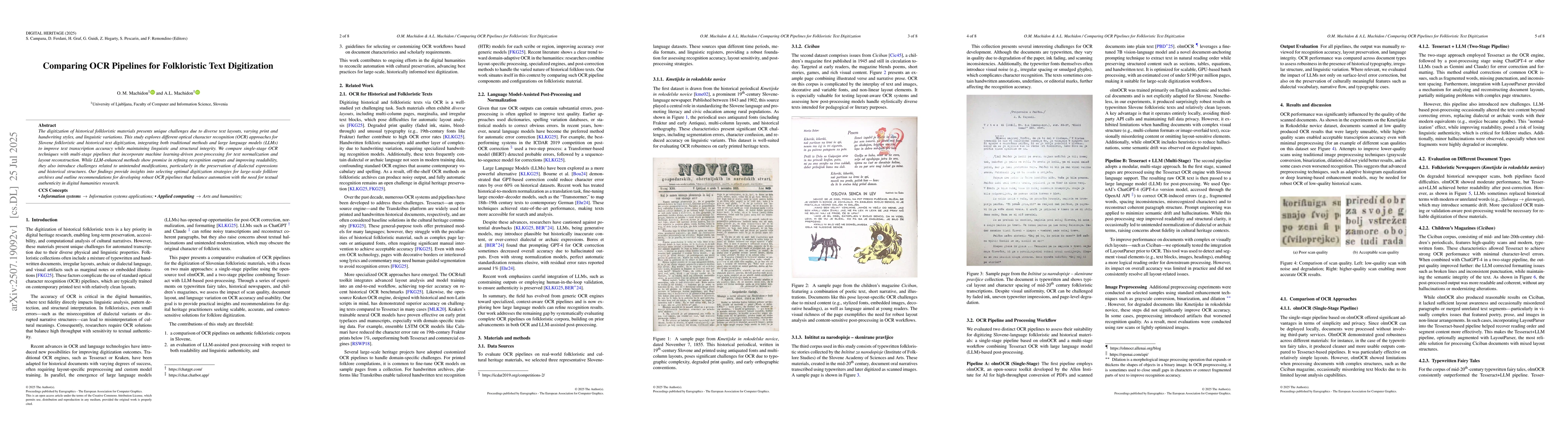 The digitization of historical folkloristic materials presents unique challenges due to diverse text layouts, varying print and handwriting styles, and linguistic variations. This study explores different optical character recognition (OCR) approaches for Slovene folkloristic and historical text digitization, integrating both traditional methods and large language models (LLMs) to improve text transcription accuracy while maintaining linguistic and structural integrity. We compare single-stage OCR techniques with multi-stage pipelines that incorporate machine learning-driven post-processing for text normalization and layout reconstruction. While LLM-enhanced methods show promise in refining recognition outputs and improving readability, they also introduce challenges related to unintended modifications, particularly in the preservation of dialectal expressions and historical structures. Our findings provide insights into selecting optimal digitization strategies for large-scale folklore archives and outline recommendations for developing robust OCR pipelines that balance automation with the need for textual authenticity in digital humanities research.