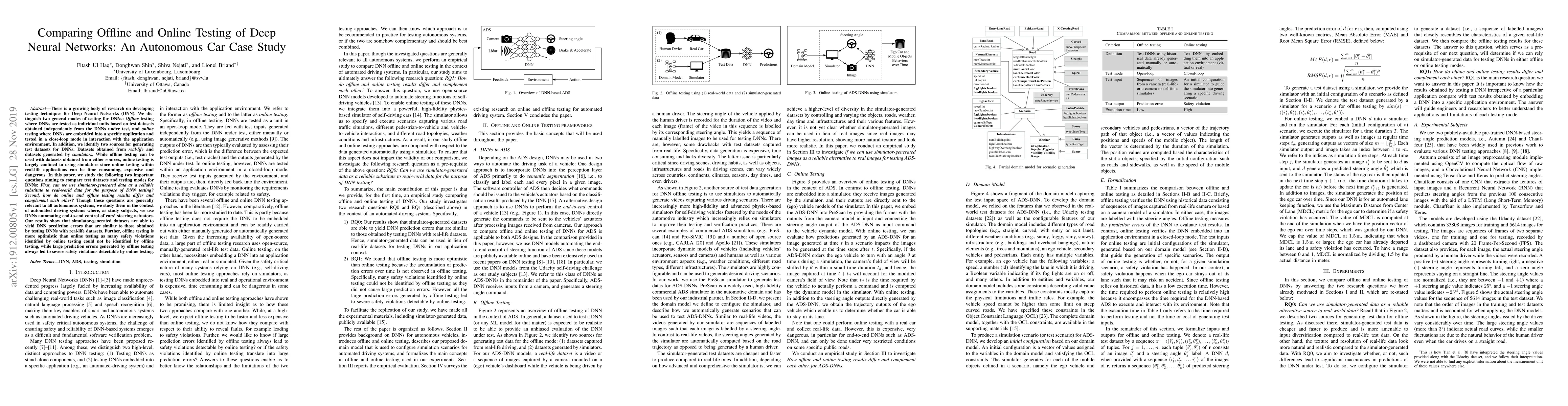 This paper compares offline and online testing of deep neural networks (DNNs) in the context of autonomous driving, finding that simulator-generated data can be a reliable substitute for real-world data. It concludes that offline testing tends to be more optimistic, while online testing identifies more safety violations that offline testing misses.